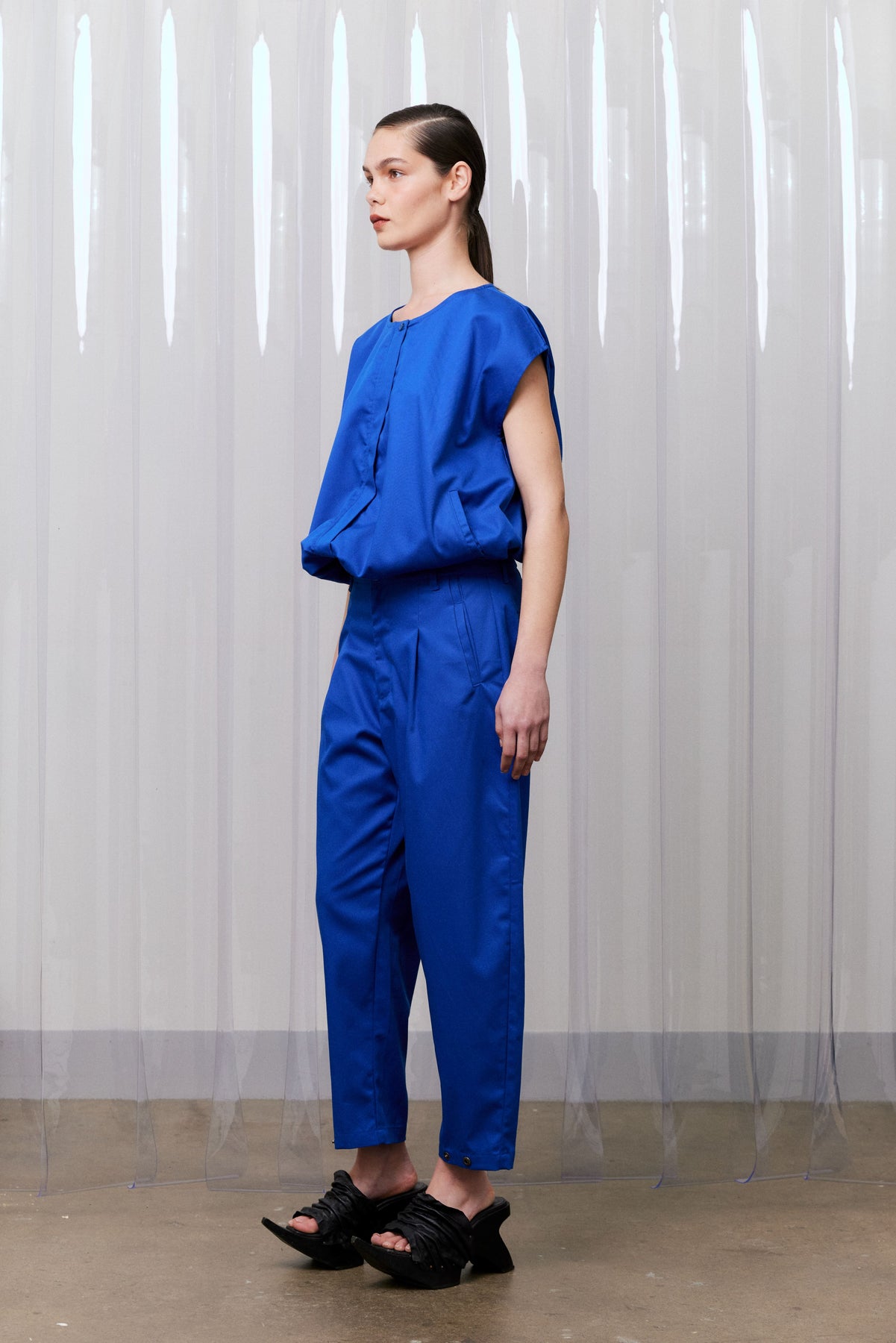 The Rounded Pant is a new high waisted pant style with a pleated front and welt side pockets. Softly tapered in leg shape with press studs at the cuff to cinch in even more, it creates a beautifully unique inverted pleat at the cuff.
