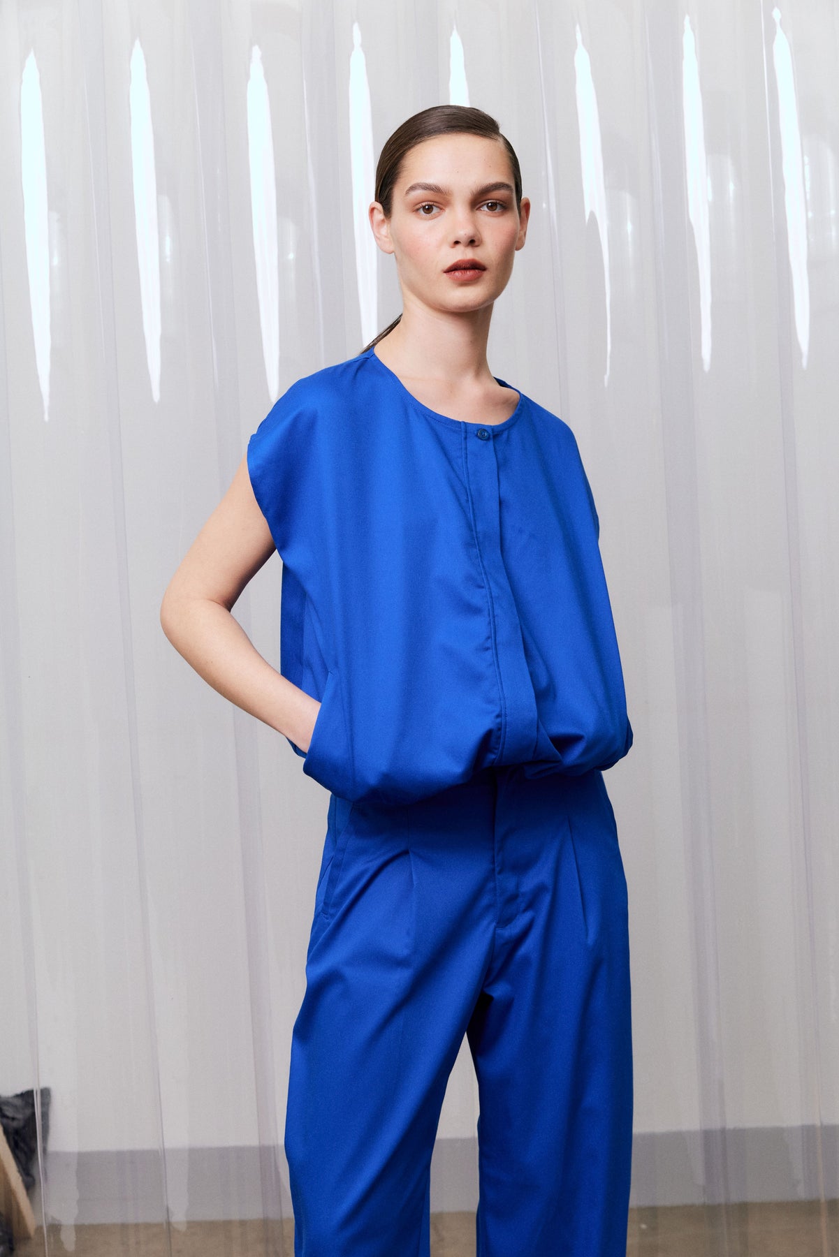 Styled here with the School of Sardines Tee and the Bubble Tea Vest in Cobalt
