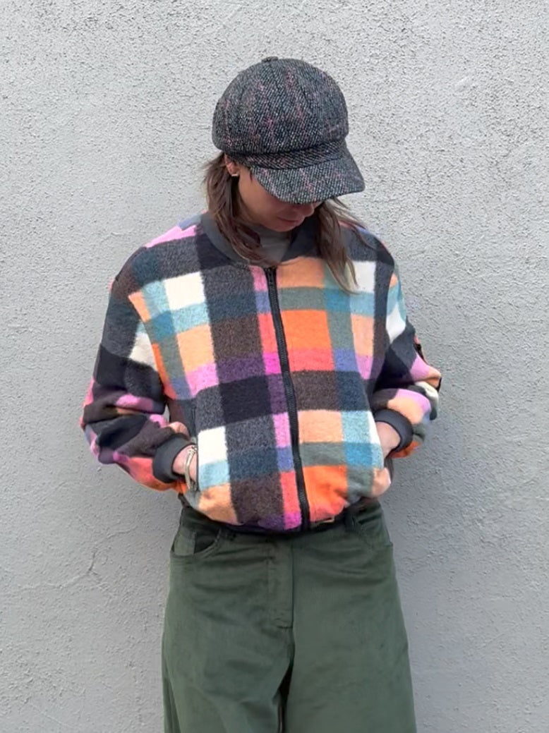 Super cosy fleece classic Bomber in rainbow pastel squares. Featuring a zip opening and a ribbed collar, cuffs and hem. Lightweight and super warm, this versatile piece features a palette of pink, orange, blue, cream, grey, and black is easy to style back with all your wardrobe staples. This piece adds a pop of colour to any outfit or modd.
