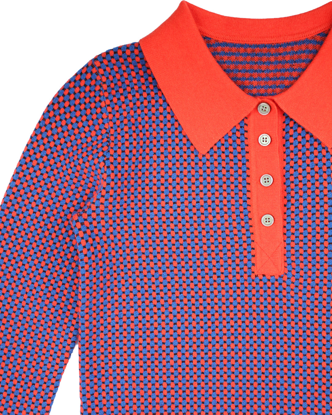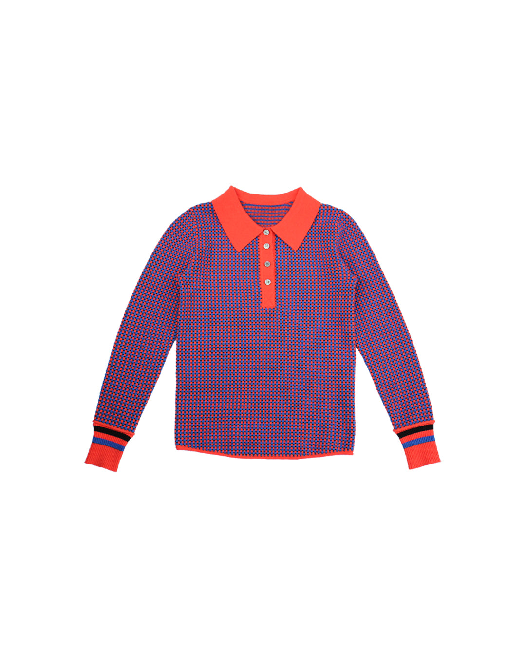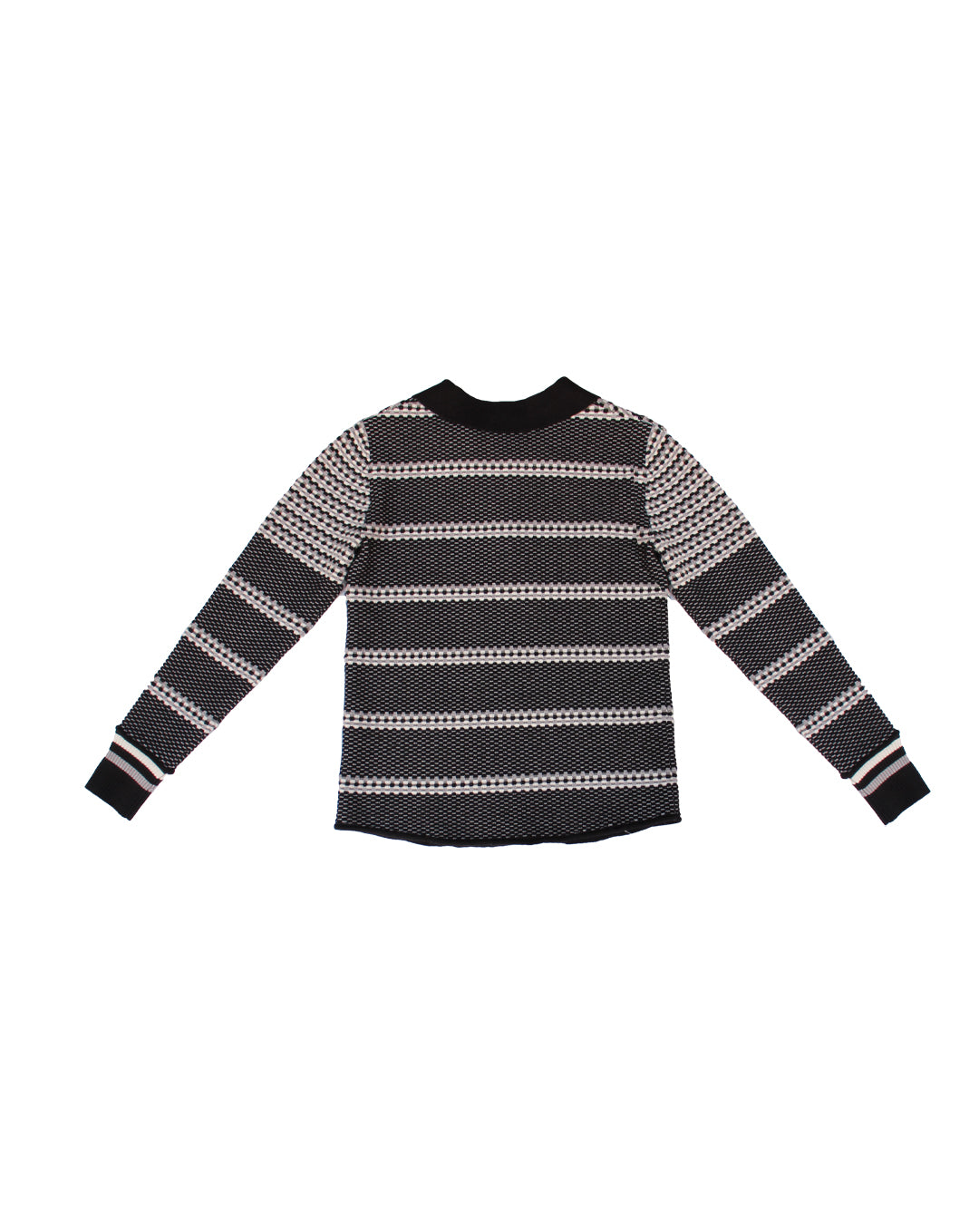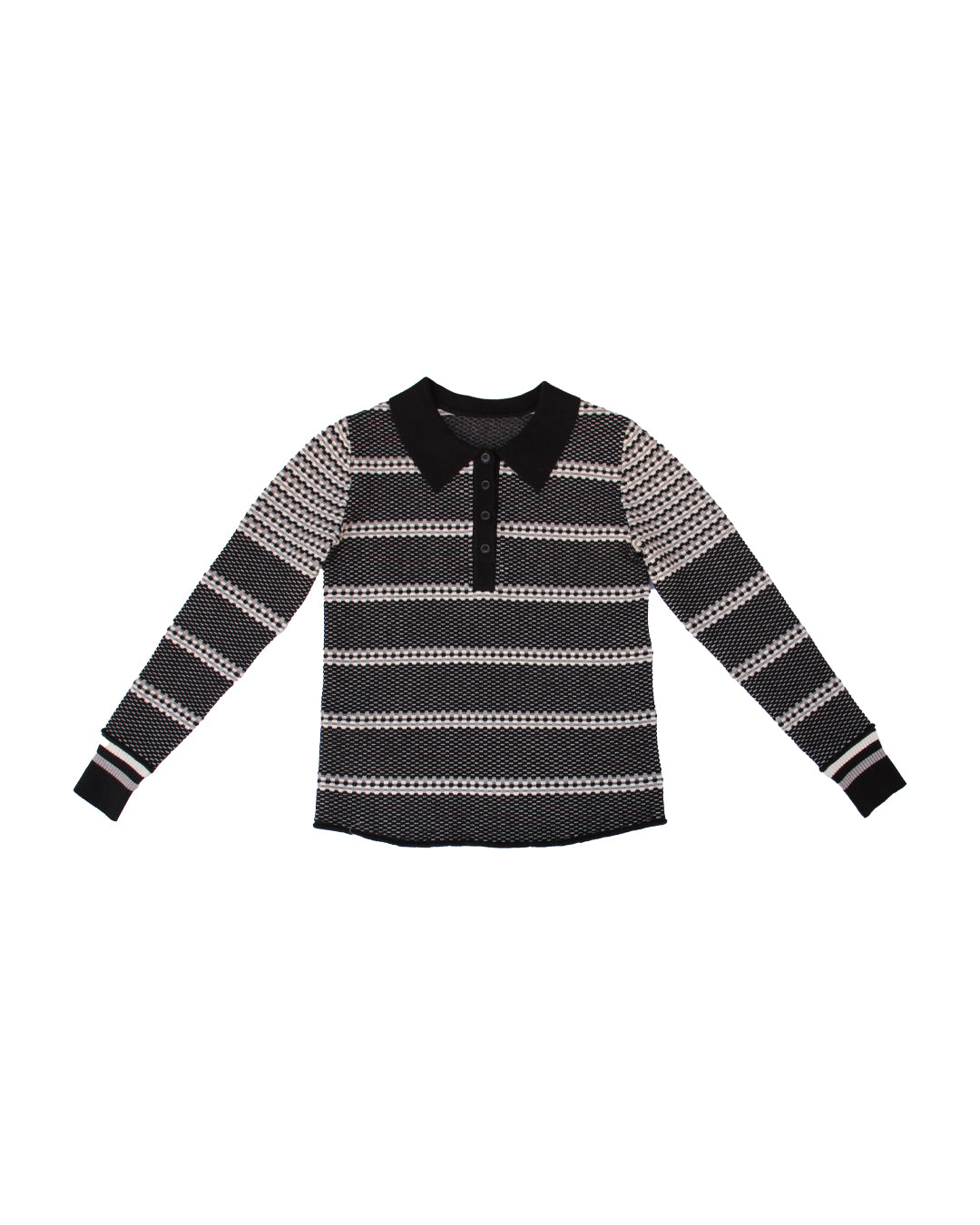 Knitted polo top with graphic cubic design in cascading sizes creating a striped look. A long sleeve top with ribbed collar and cuffs, this piece screams Autumn favorite!