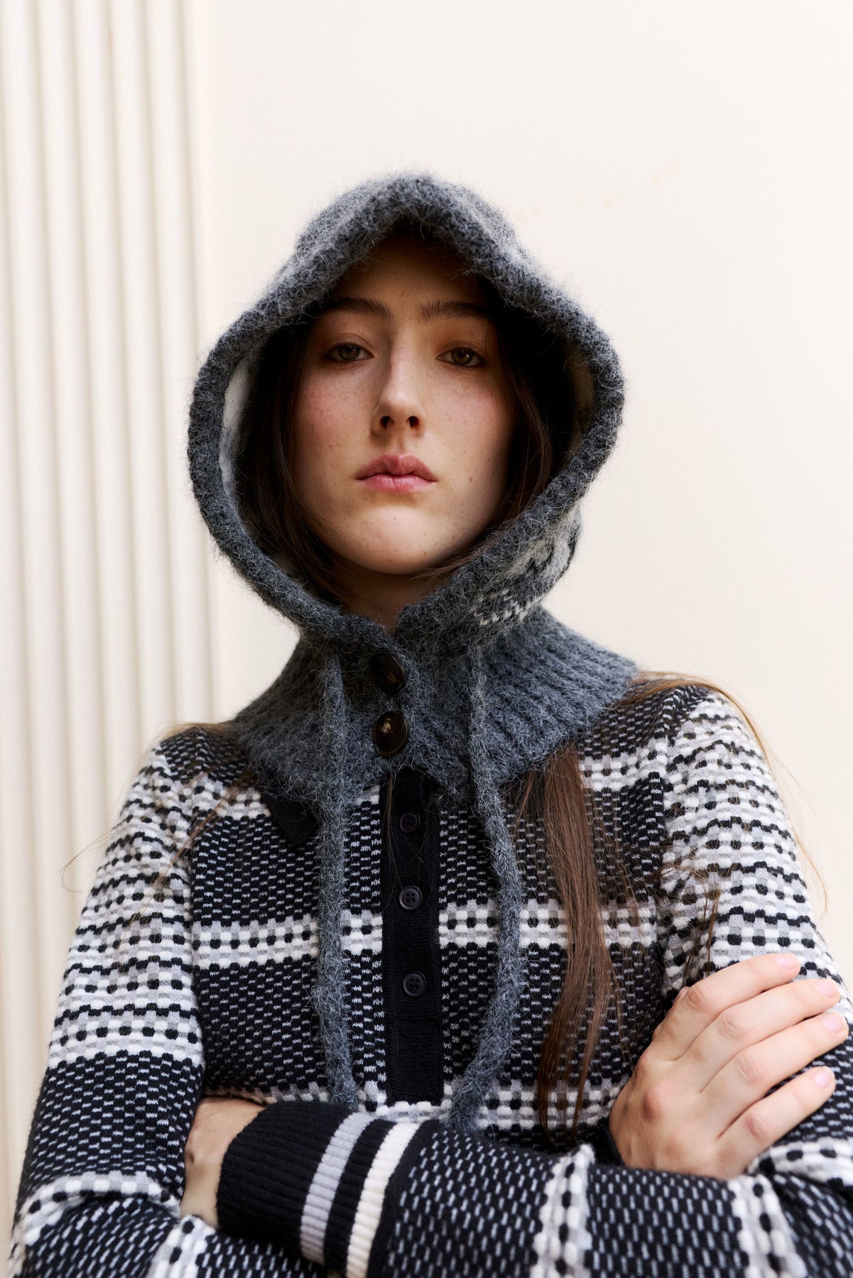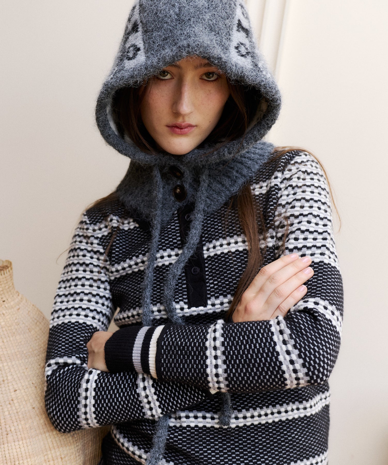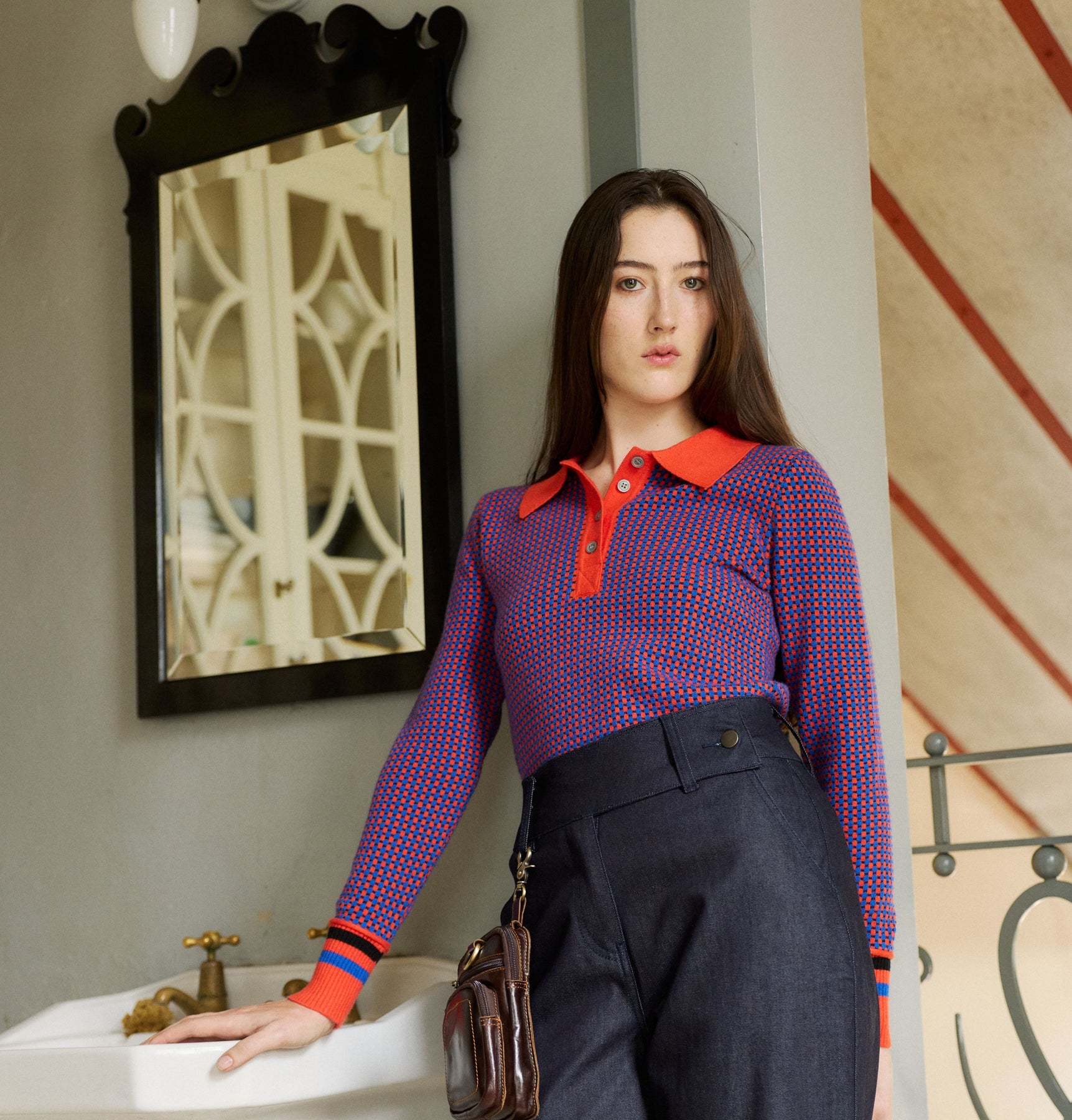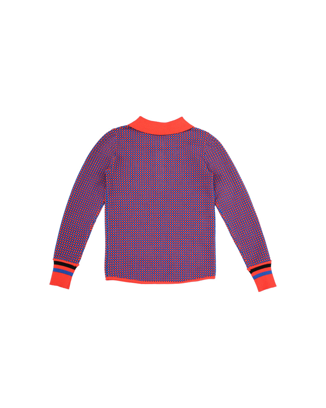 Knitted polo top with graphic cubic design in cascading sizes creating a striped look. A long sleeve top with ribbed collar and cuffs, this piece screams Autumn favorite!