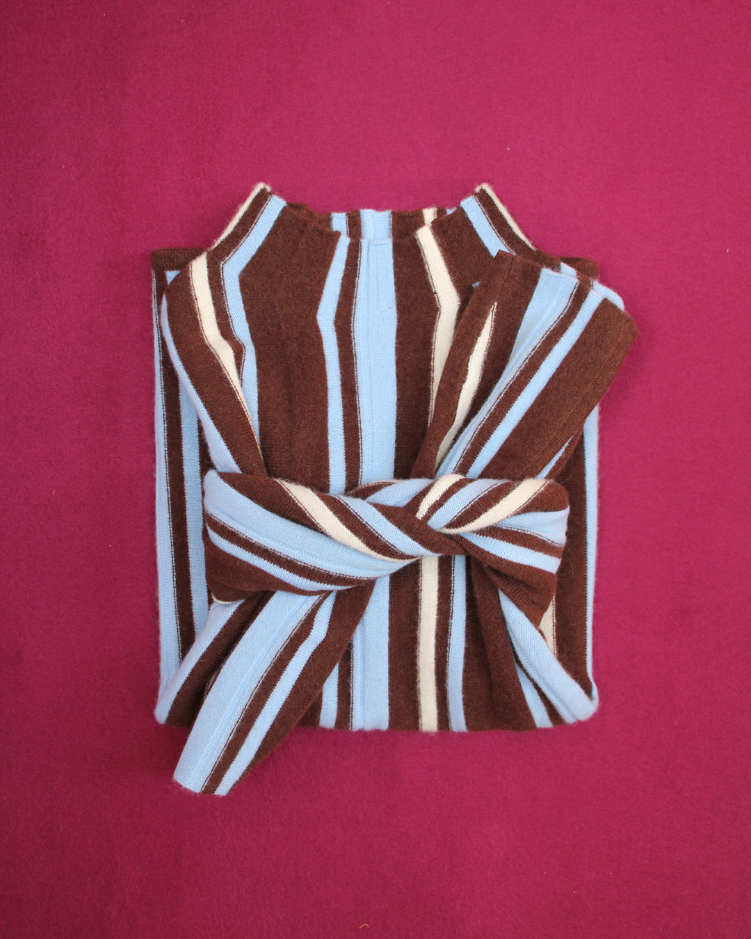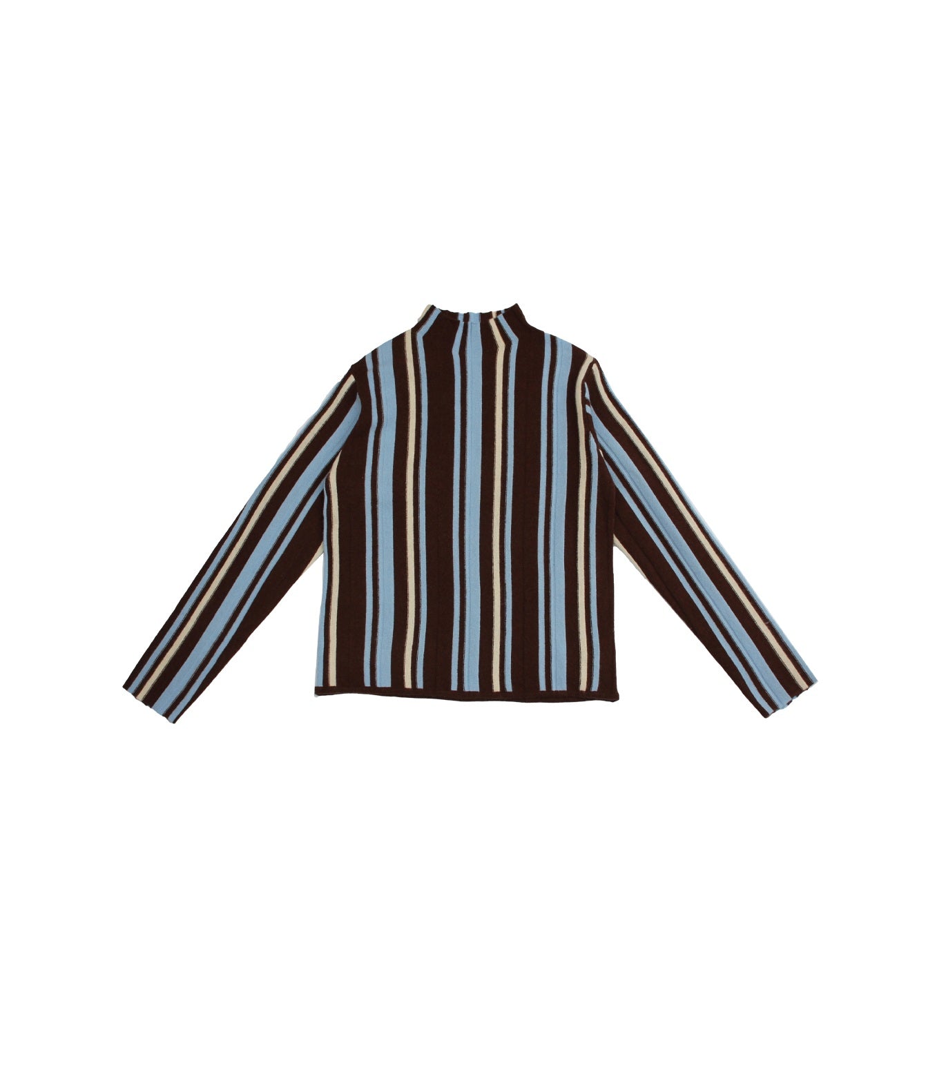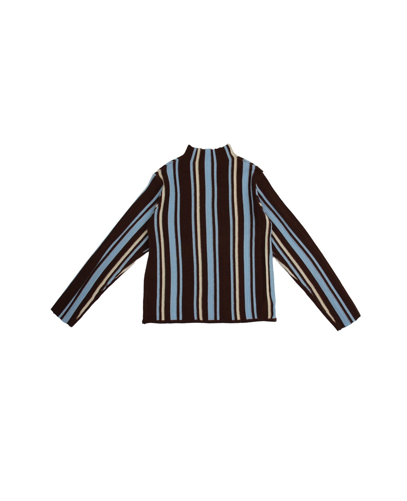 Bold vertical stripe pure wool roll neck knit jumper, in brown base with pale blue and white stripes. Warm and fuzzy, thick and snuggly. Keeping your winters warm, 90s vibes.