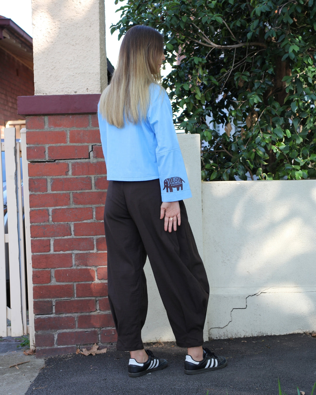 The Cocoon Pant is a new pant style with a pleated front and inverted pleats at the sides to create a balloon shape leg, and inverted pleats at the ankle to taper the leg above the hem. A very sculptural effect, a statement trouser. Finished with welted pockets at the hip and back, set on waistband with belt loops and front button and zip closure. In a stretch chocolate brown drill.