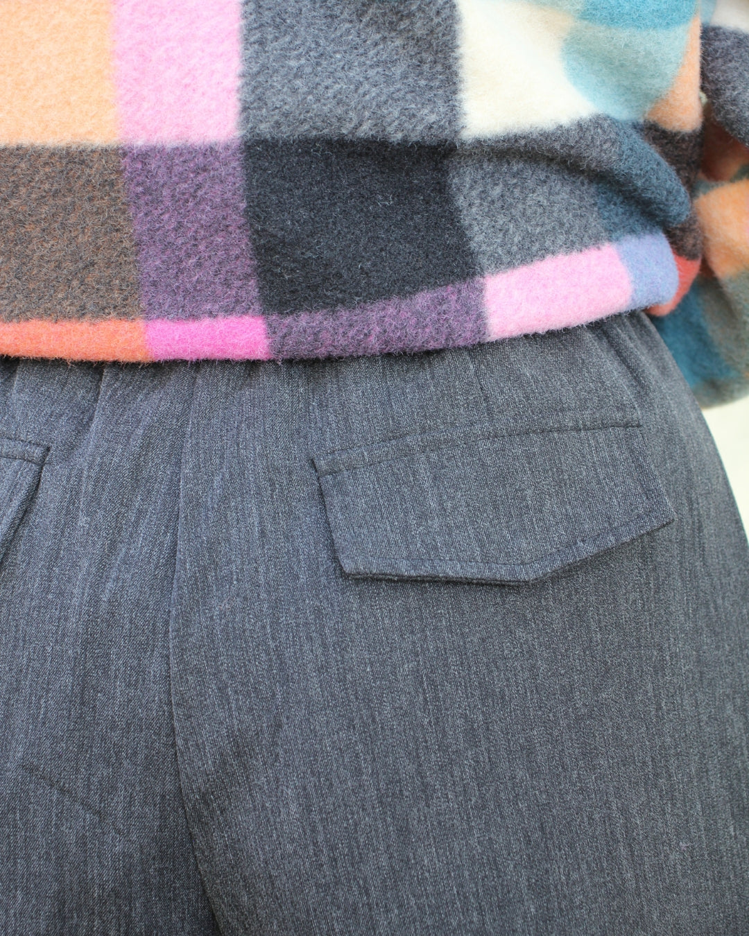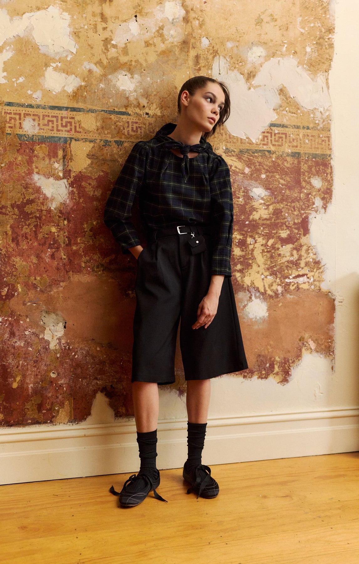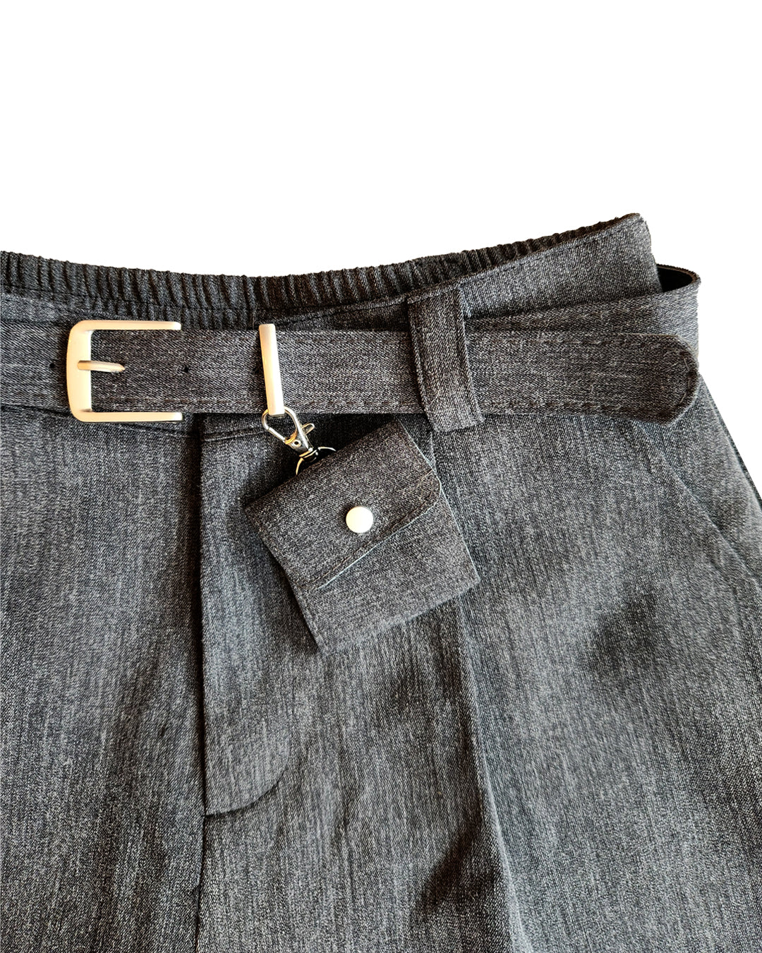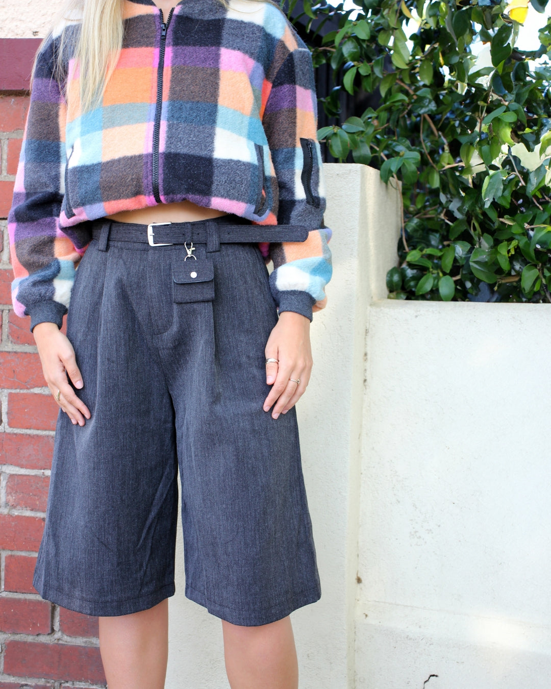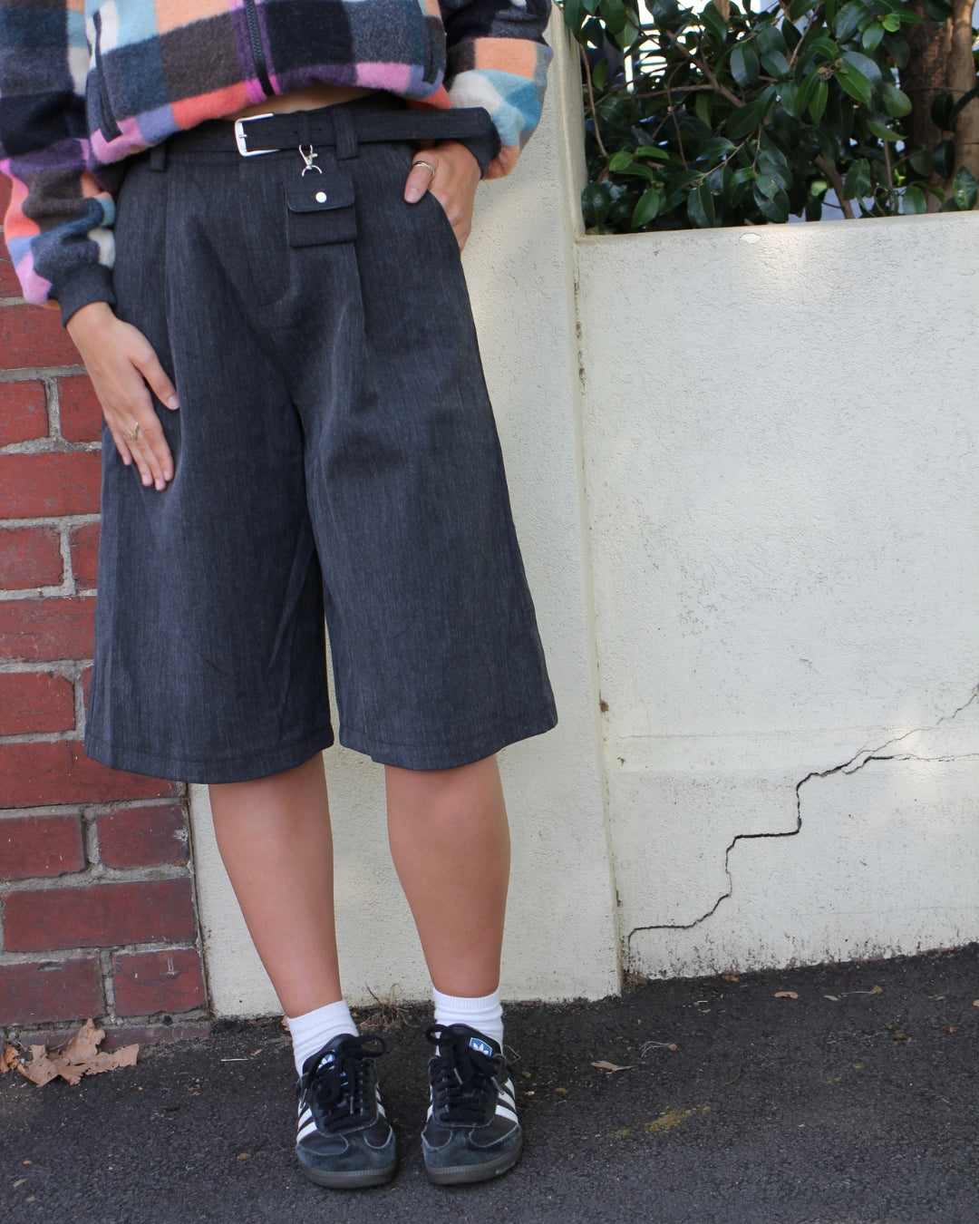 Super cute tailored Bermuda shorts with a belt and key ring mini pouch bag in matching fabric finish. Encased elastic a the back of waist, makes these a flexible and comfortable fit. Office cool, office core