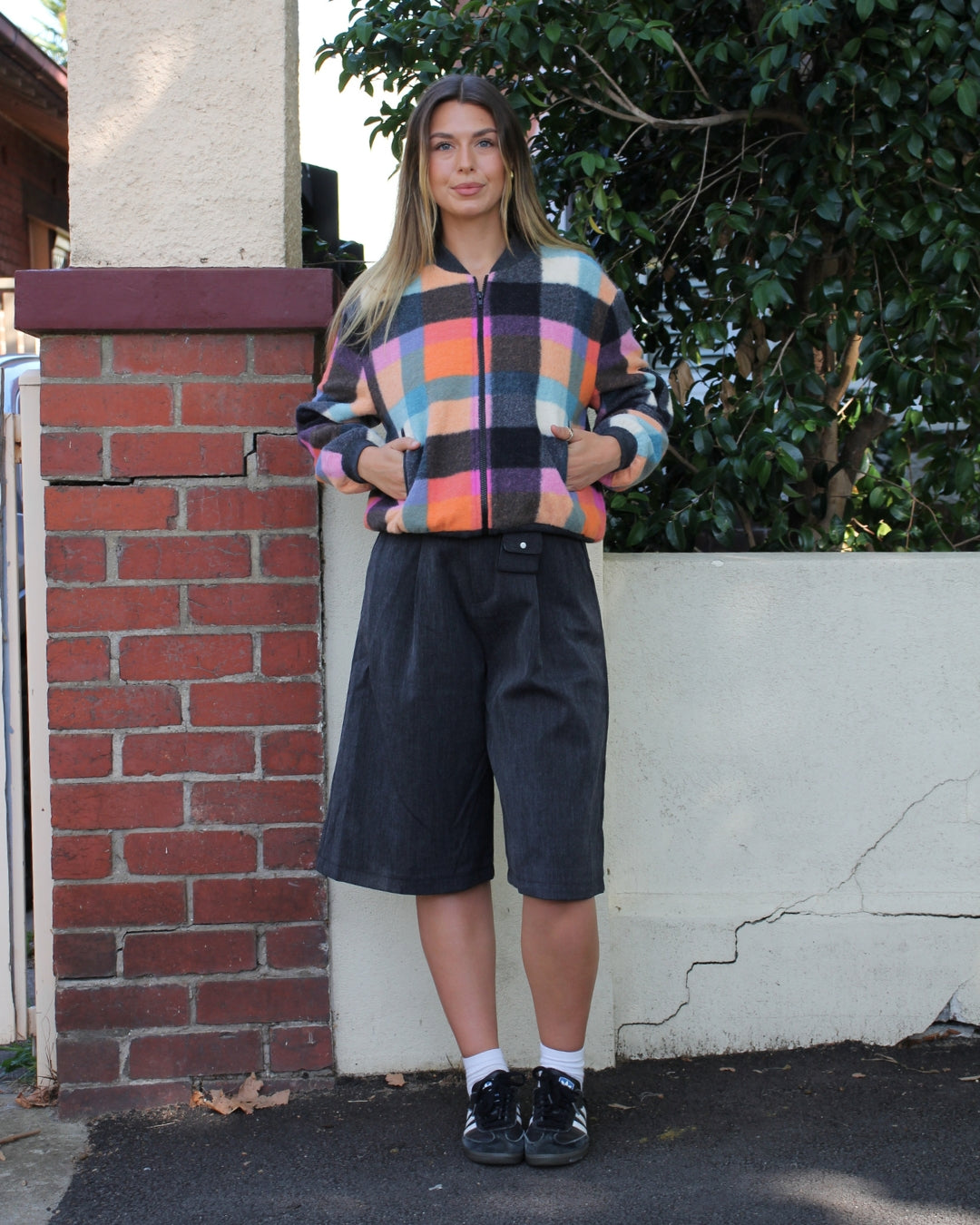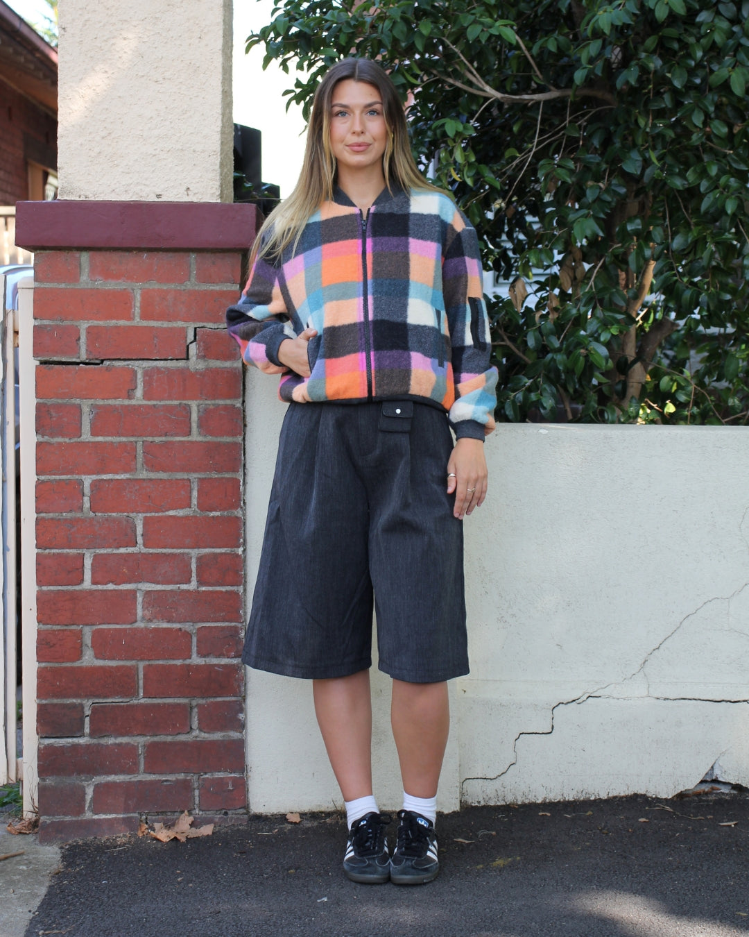 Styled here with the Scarf Top and Rainbow Square Up Bomber