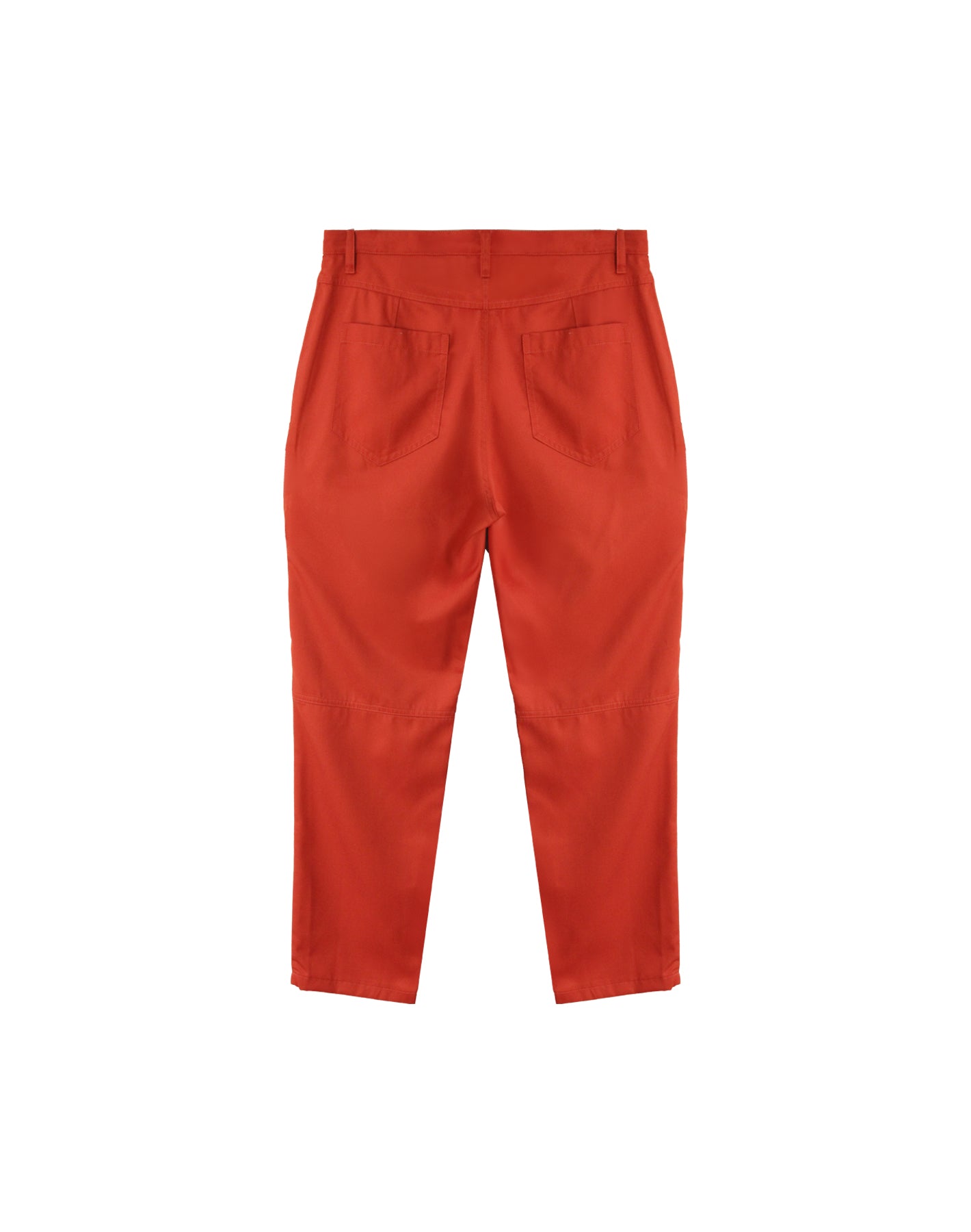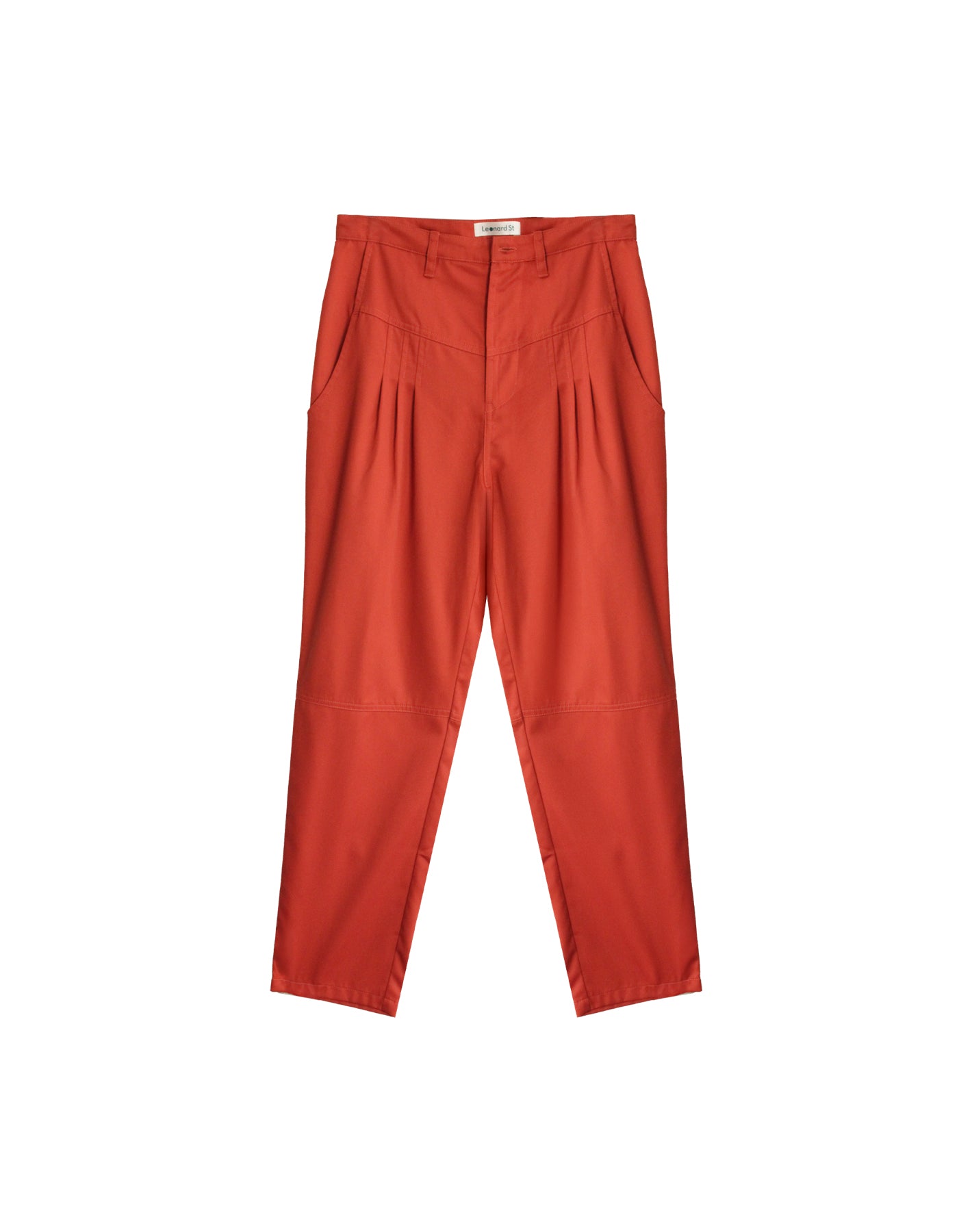 Inspired by my Mums 80s leather pants, our new 80s inspired pant in a tomato red with a yoke front, sits high on the waist with pleats in front, and a carrot leg.