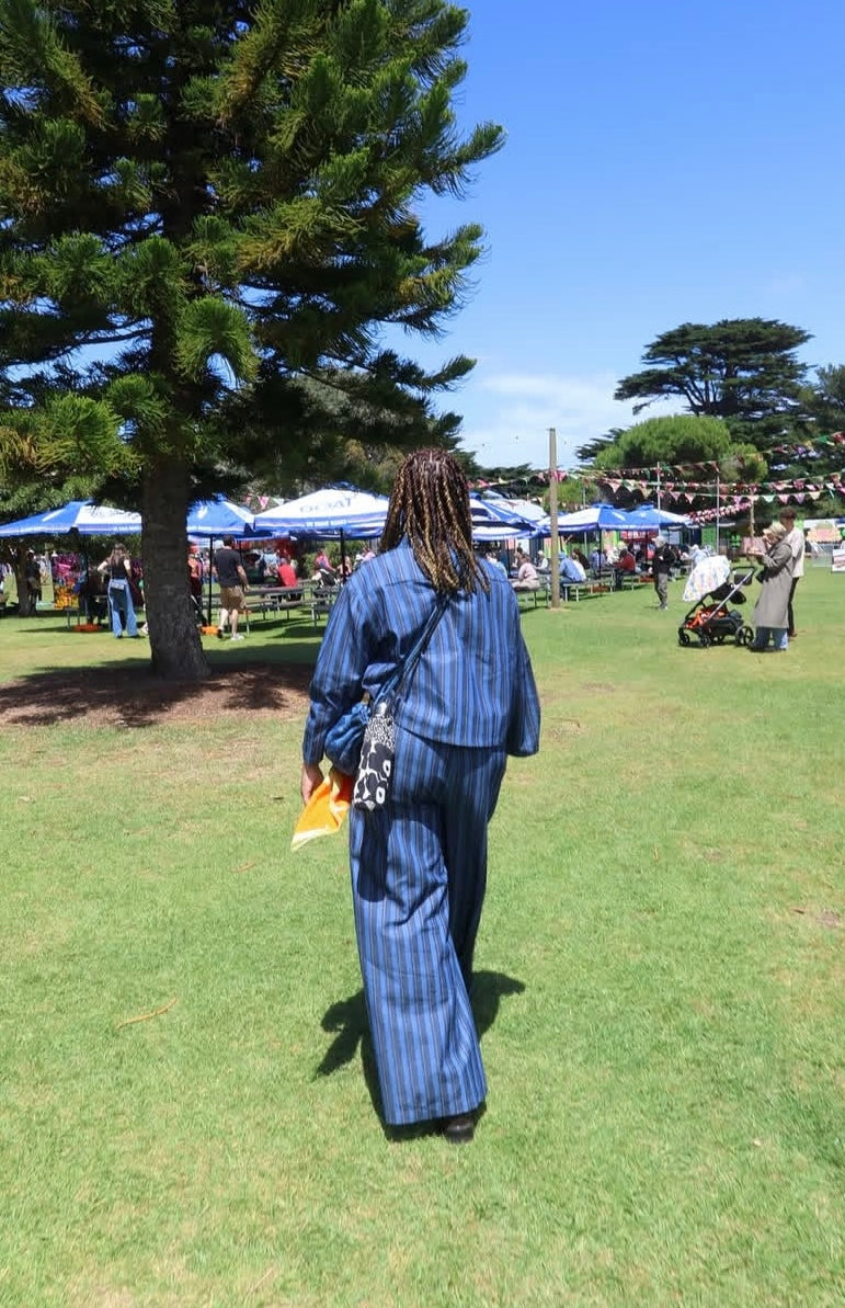 Beautiful wide leg pant set on a high waist - with encased elastic waistband at the back for comfort and fit - with a wide leg, pockets at the hip and belt loops. In a light weight denim fabric with a dark blue and mid blue stripe and white ticking stitch woven detailing this pant can go maximum impact or breezy weekend vibes. So easy to style in this palette, a basic top will let the pants shine, or go maximalist with stripe shirts and layers.
