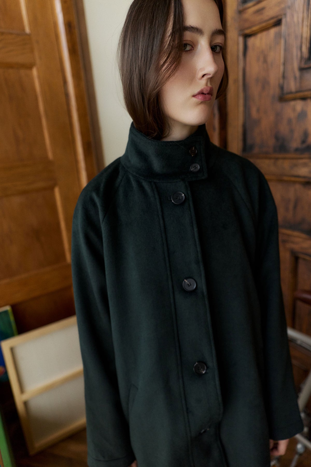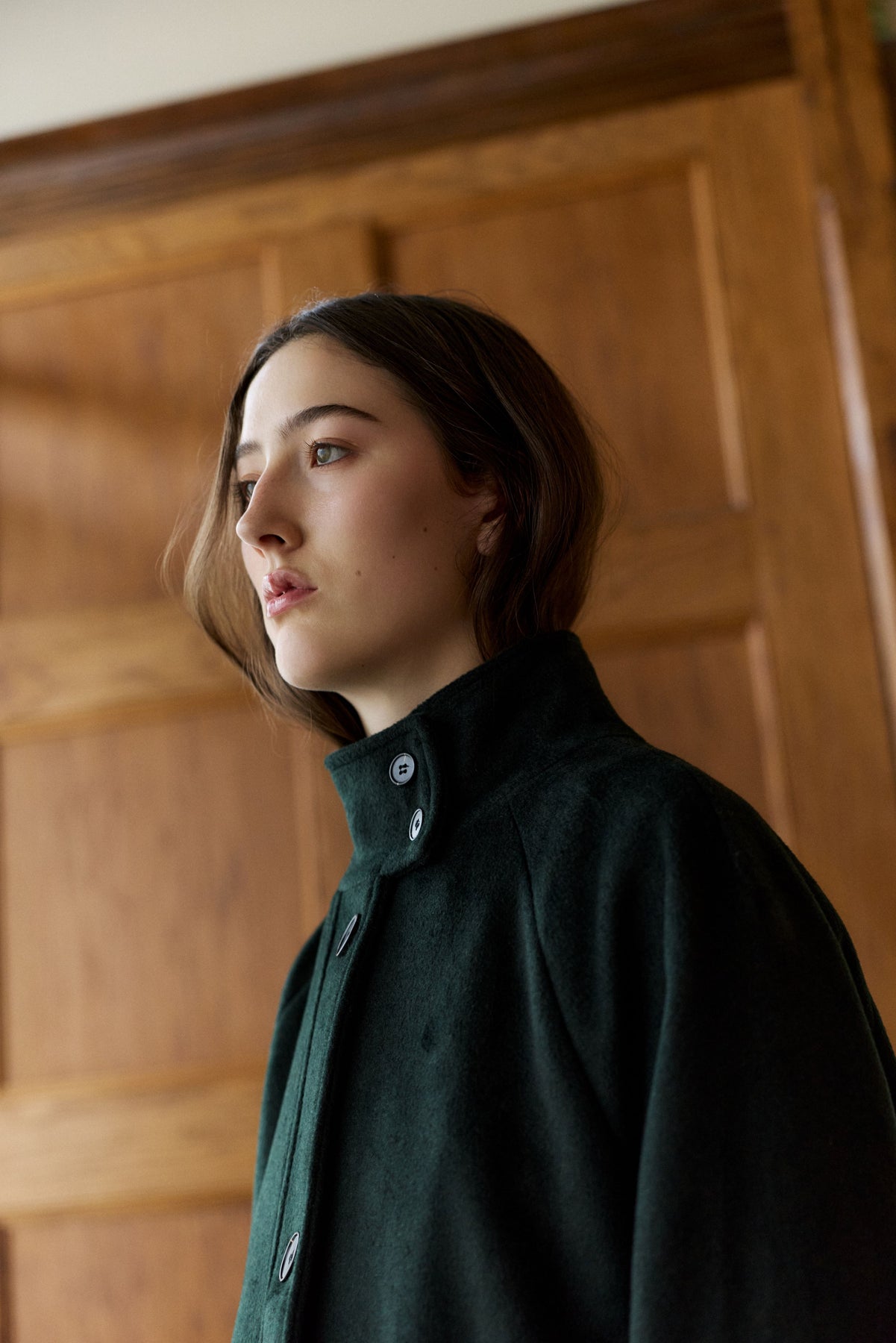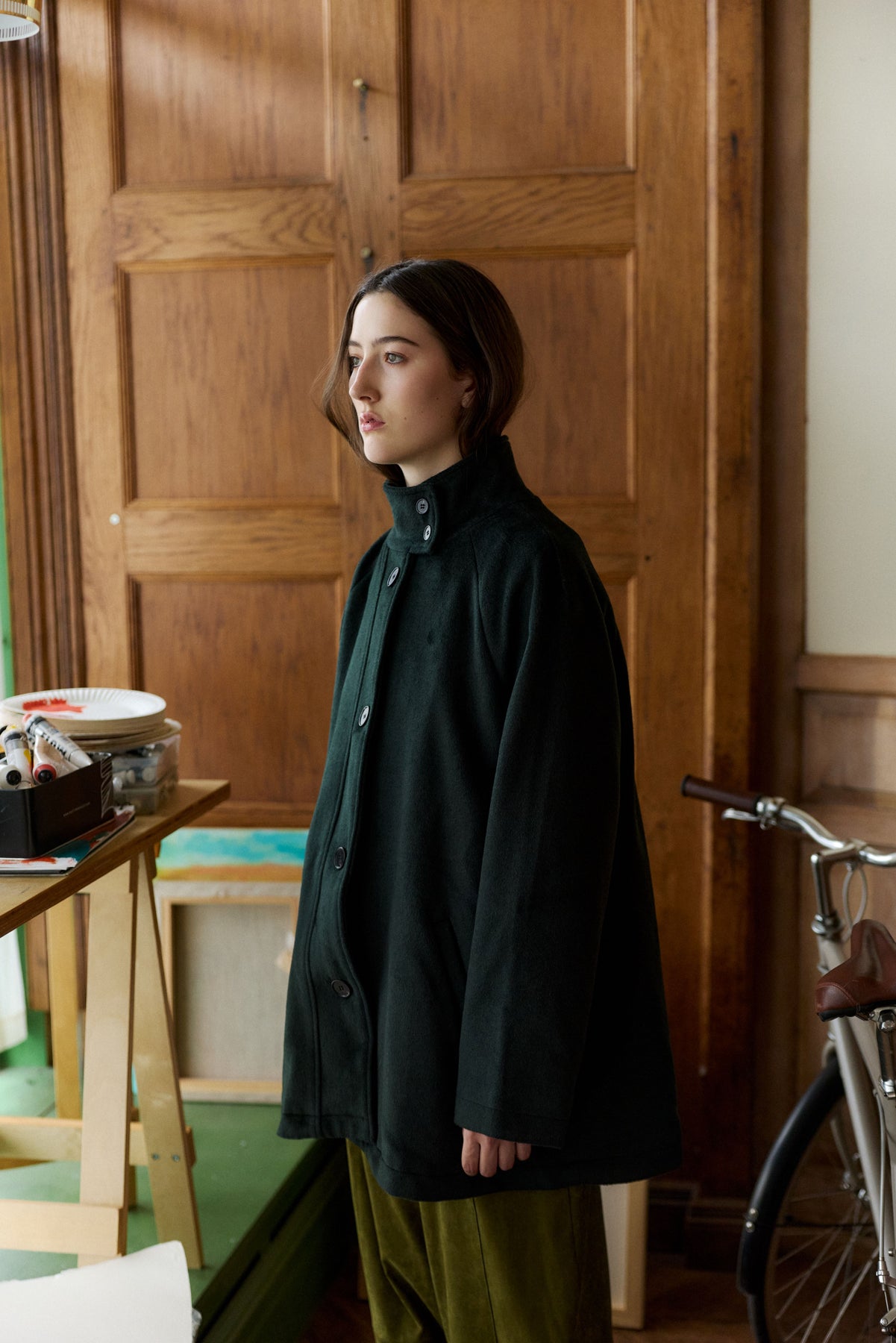 Raglan sleeve boxy swing coat perfect for countryside walks or chilly urban outfits. This deep dark Pine Forest Green pairs perfectly with earthy colours or black. This piece is timeless, modern yet a nod to the 60s swing coat in its silhouette. Featuring and a funnel neck, raglan sleeves and pockets this beauty will keep you extra warm.