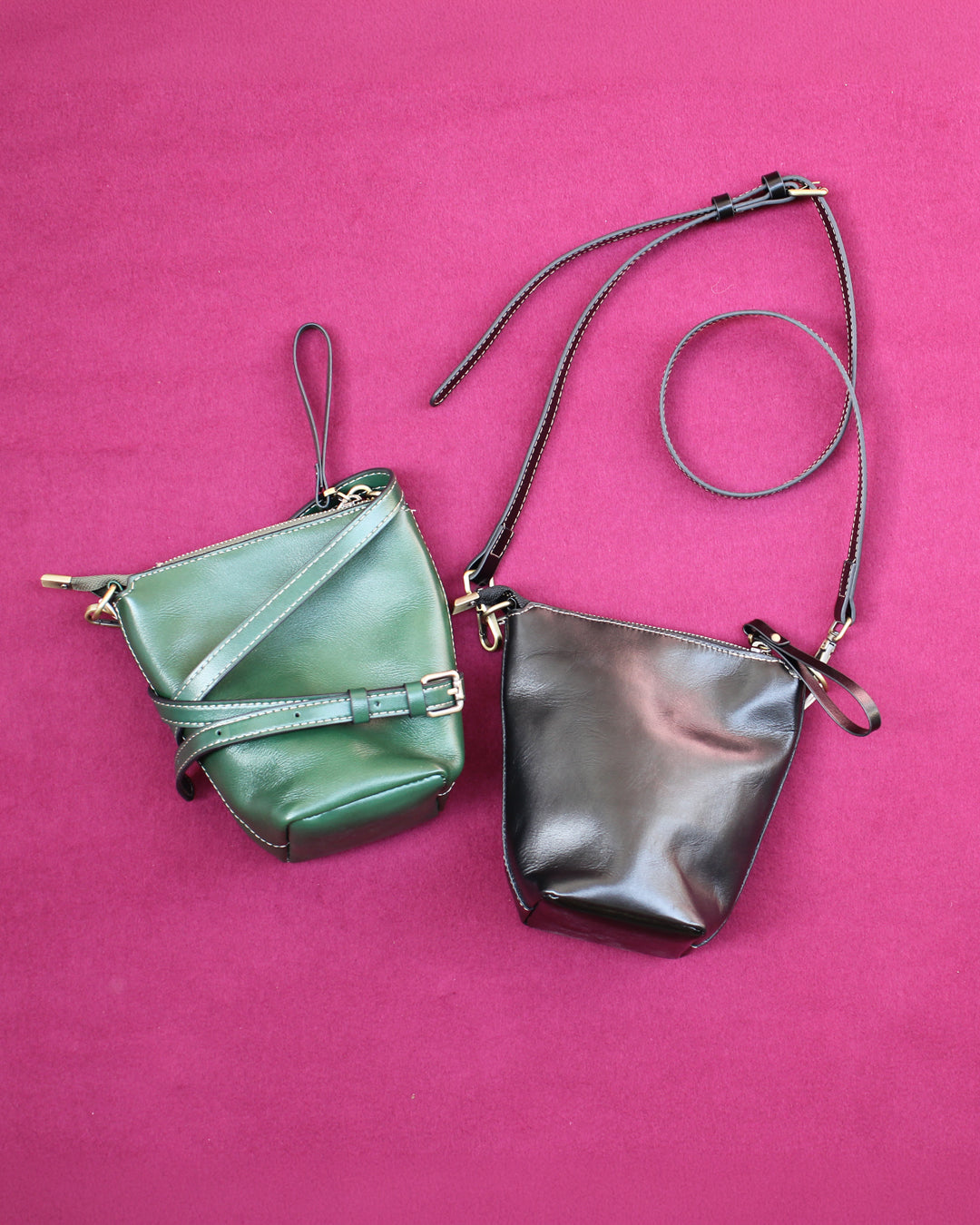 Super cute leather mini bucket bag with rounded leather strap and keychain. Featuring a front zip pouch, front zip pocket, zip top closure and solid hardware zip pulls, this guy is super cute to fit your essentials for day, night or festival.