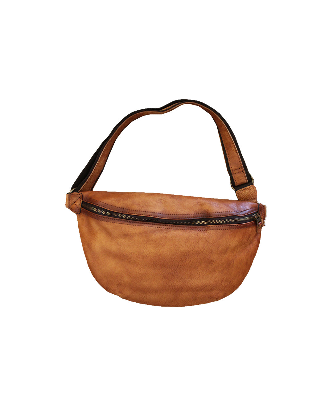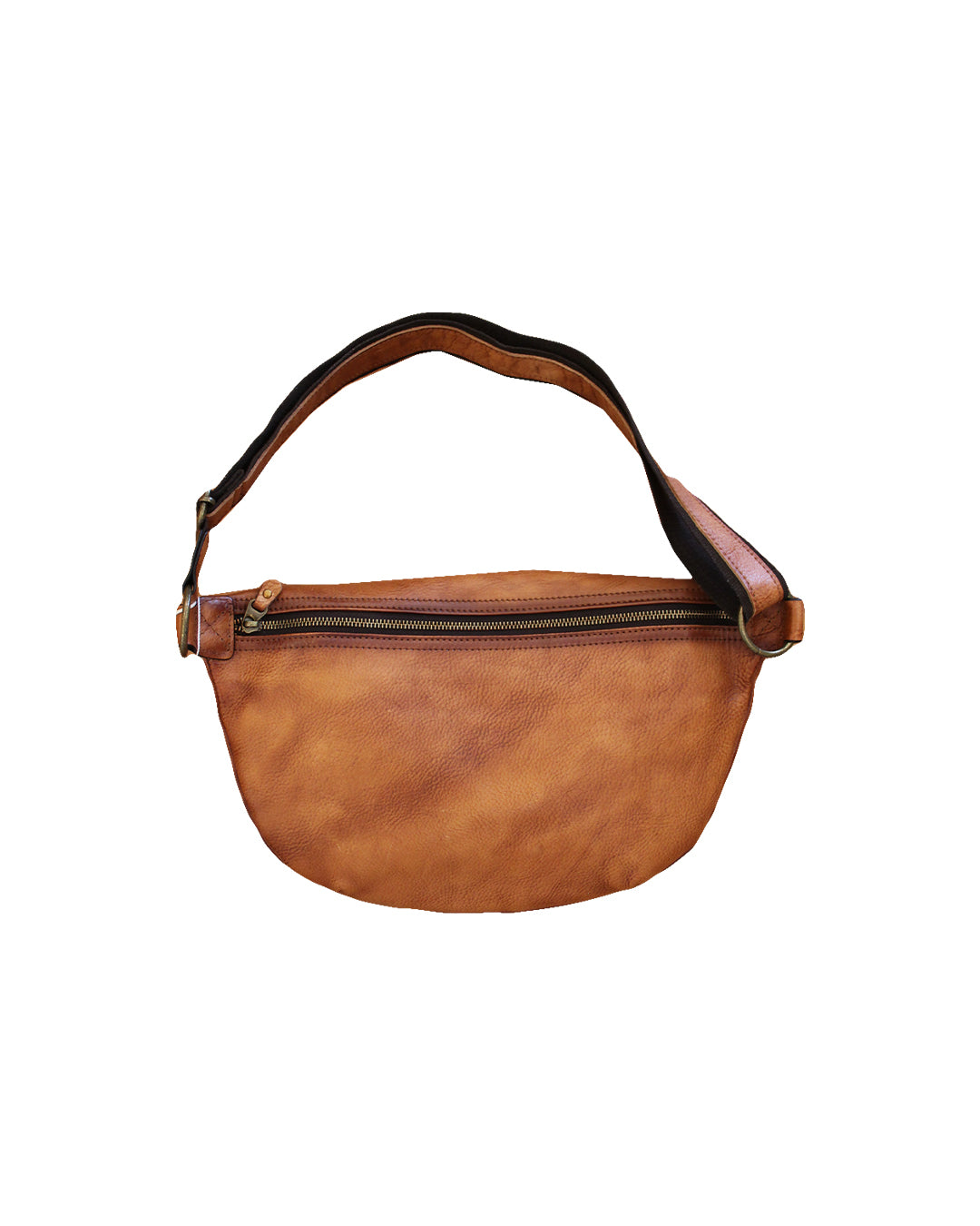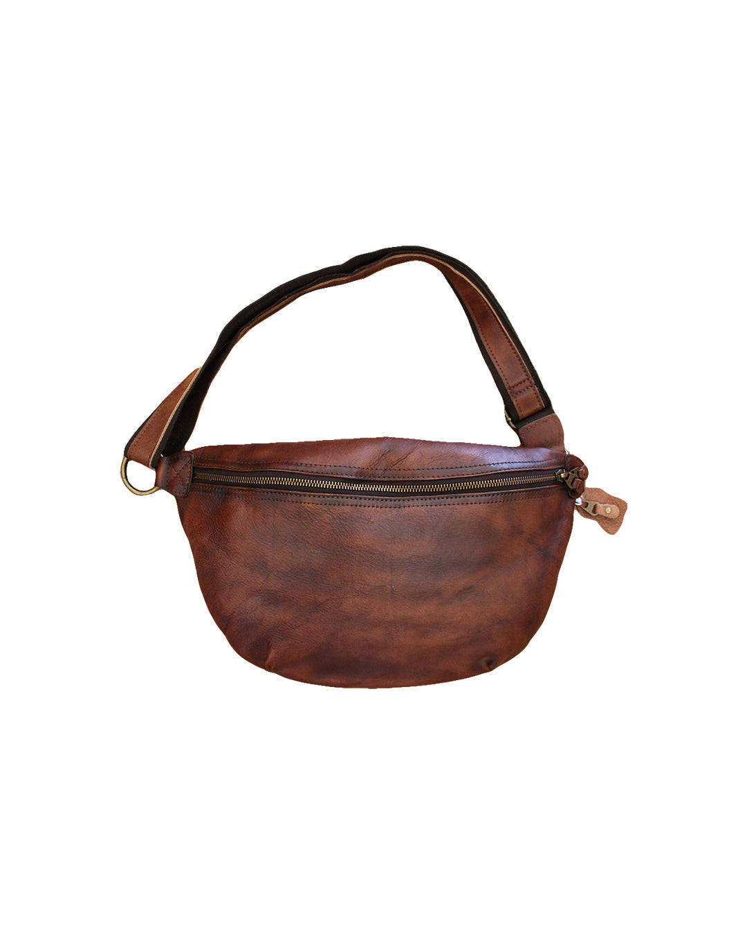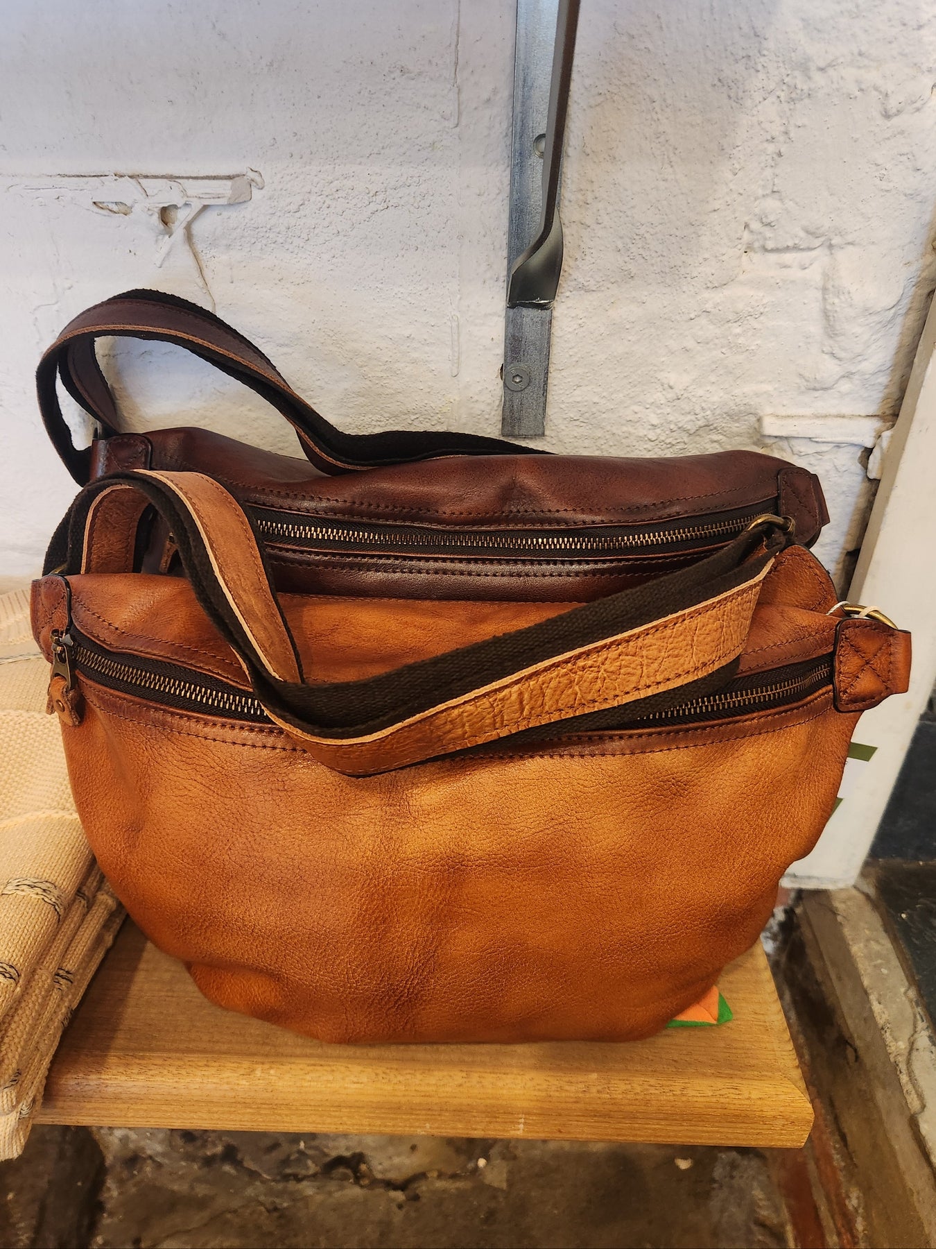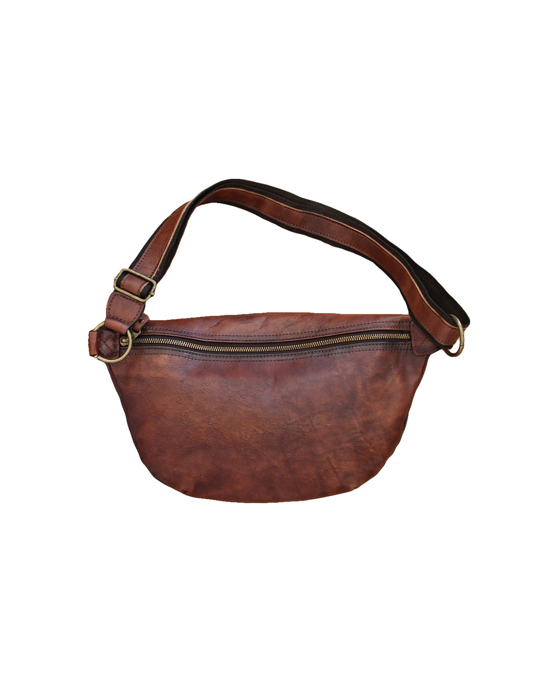 Vintage finish leather bag in a pouch shape to sit curved across the body with vintage brass rings and hardware, this bag features and adjustable strap so can be worn across the body or shoulder. Featuring a zip pocket on the back and a zip pocket inside, fully lined in cotton drill.