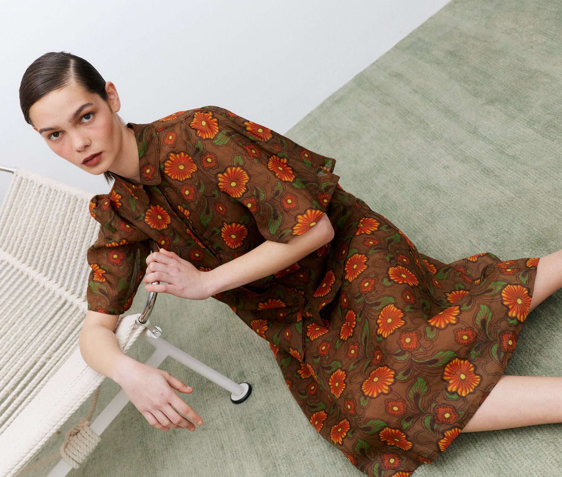Stunning retro floral in delicious brown base with orange flowers and swirling green leaves. A very 1975 floral, reminding me of childhood holidays spent at the old family beach house. Reimagined in a stunning slippery linen cloth for this Spring. A simple A-line dress with adjustable straps, falls to the knee and features pockets at the hip.