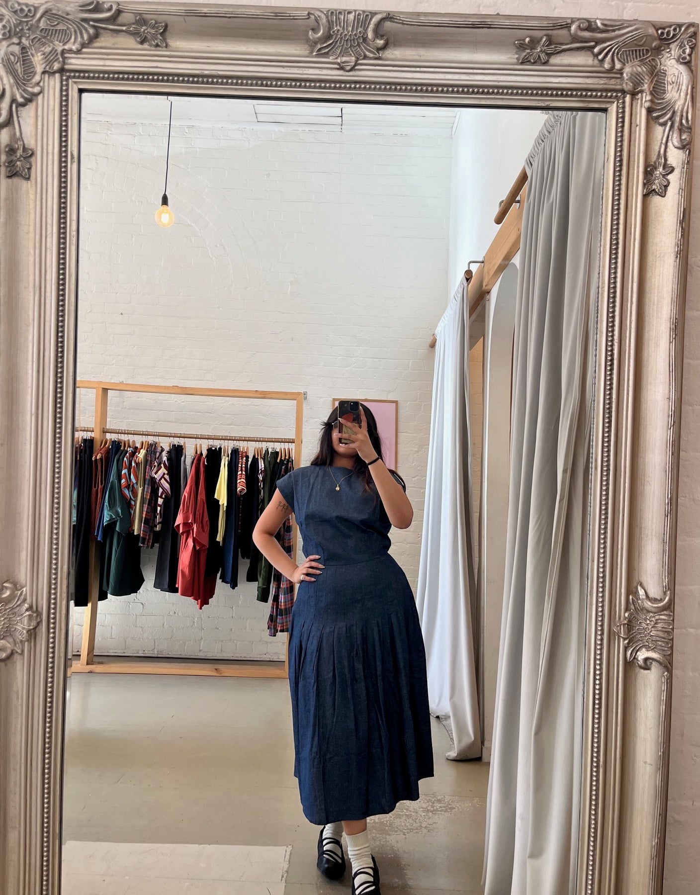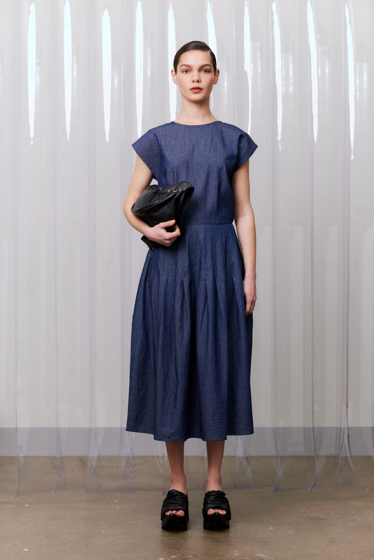 Stunning dress in light weight denim with shell button feature at the back. Featuring a loose bodice and open curves between buttons, the essential bra strap is covered, a waistline with tucked pleats to the hip opening into a soft midi skirt. Pockets at the hip of course!