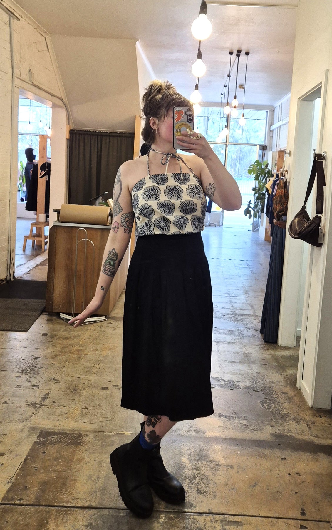 Person wearing a jacquard floral top tied as a halter neck and black skirt in a store setting
