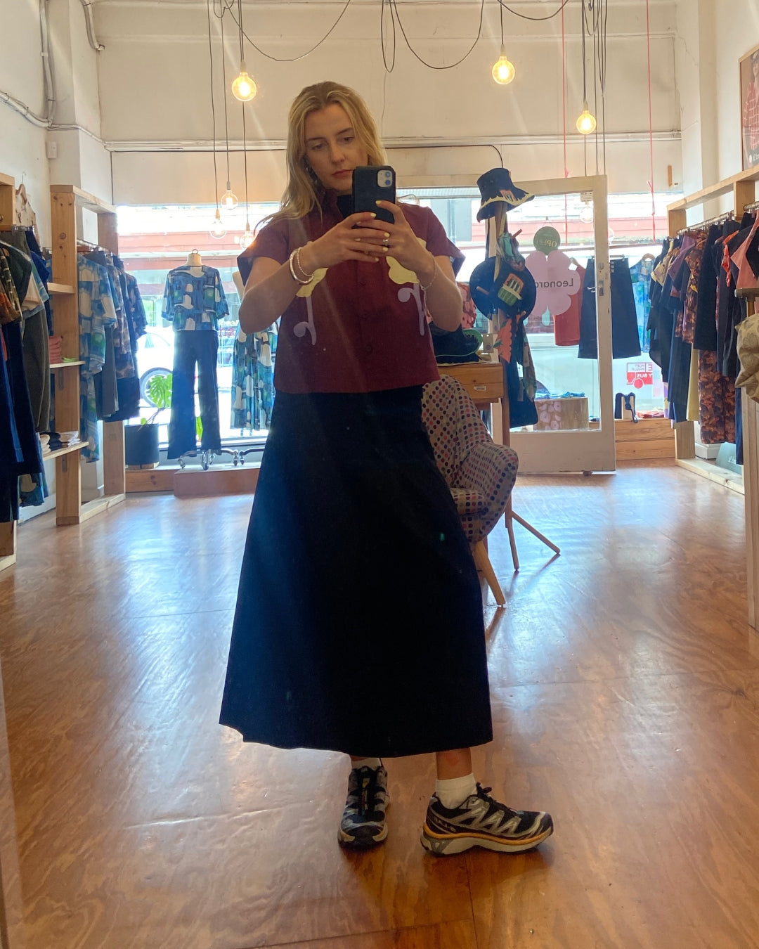 Styled with the Side Tab Pant in Blue and Pleated Skirt in Black