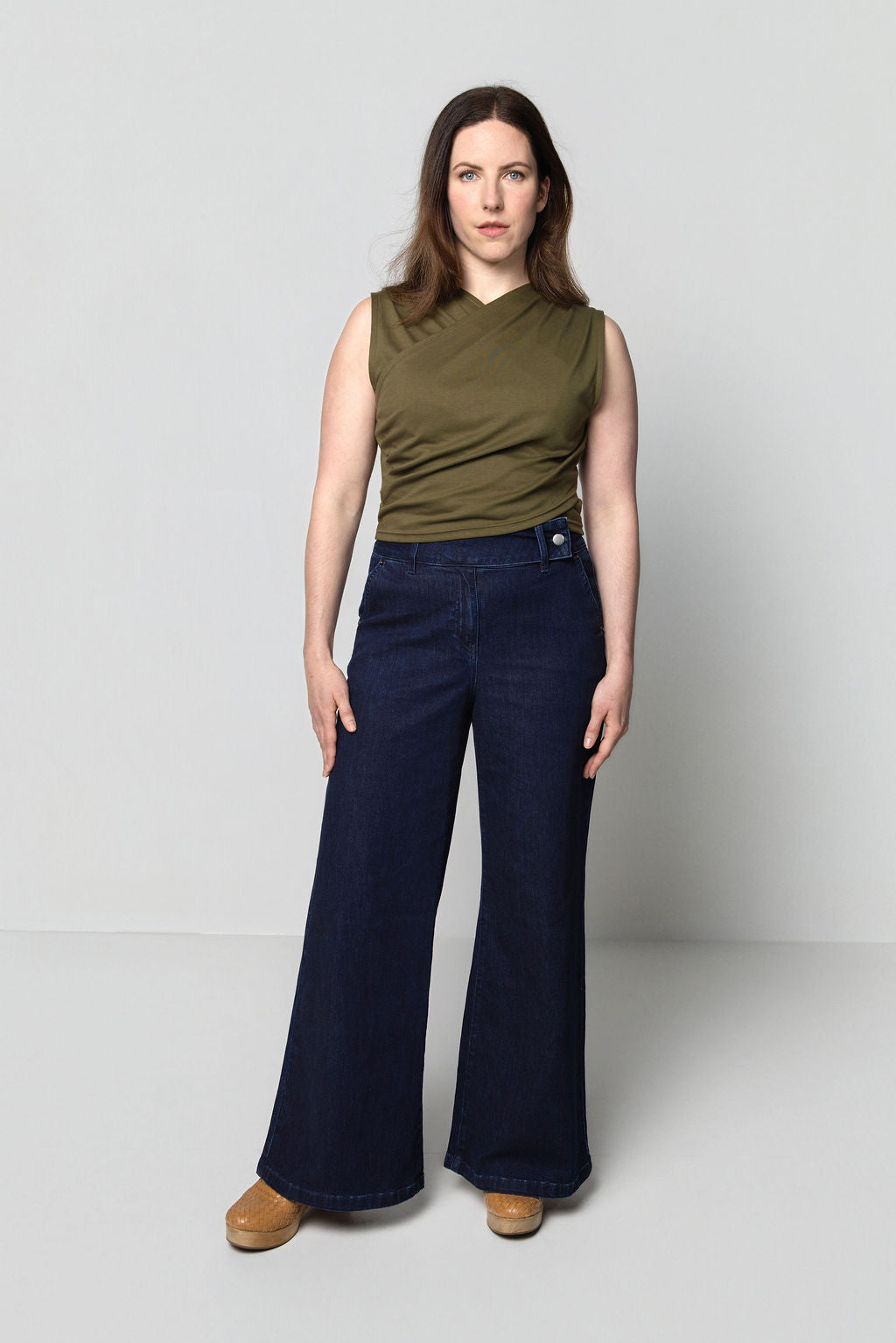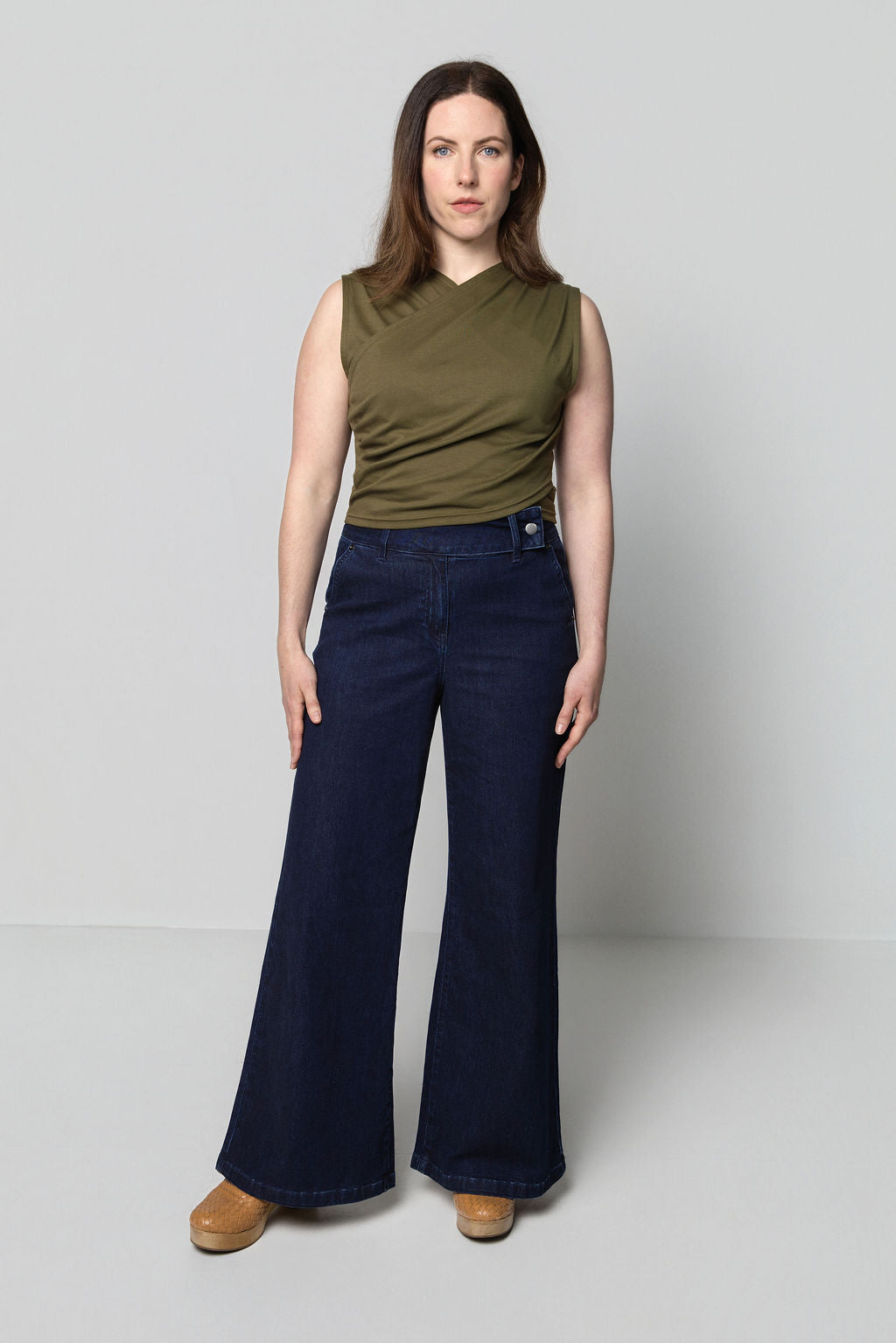 Top with pleated shoulder and drape front, so you are wrapped up like a bundle. very flattering going across the body, V can be worn high or tucked under the bodice for a lower V neckline.  A bouncy cotton spandex, looked fabulous fitted and flatters the waistline.