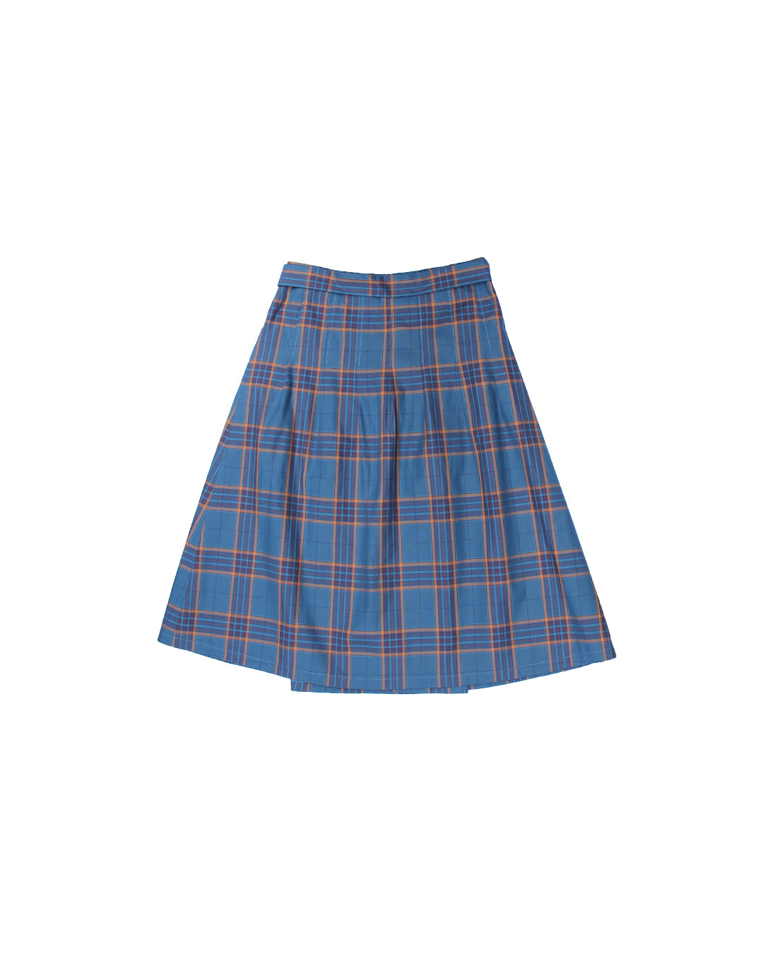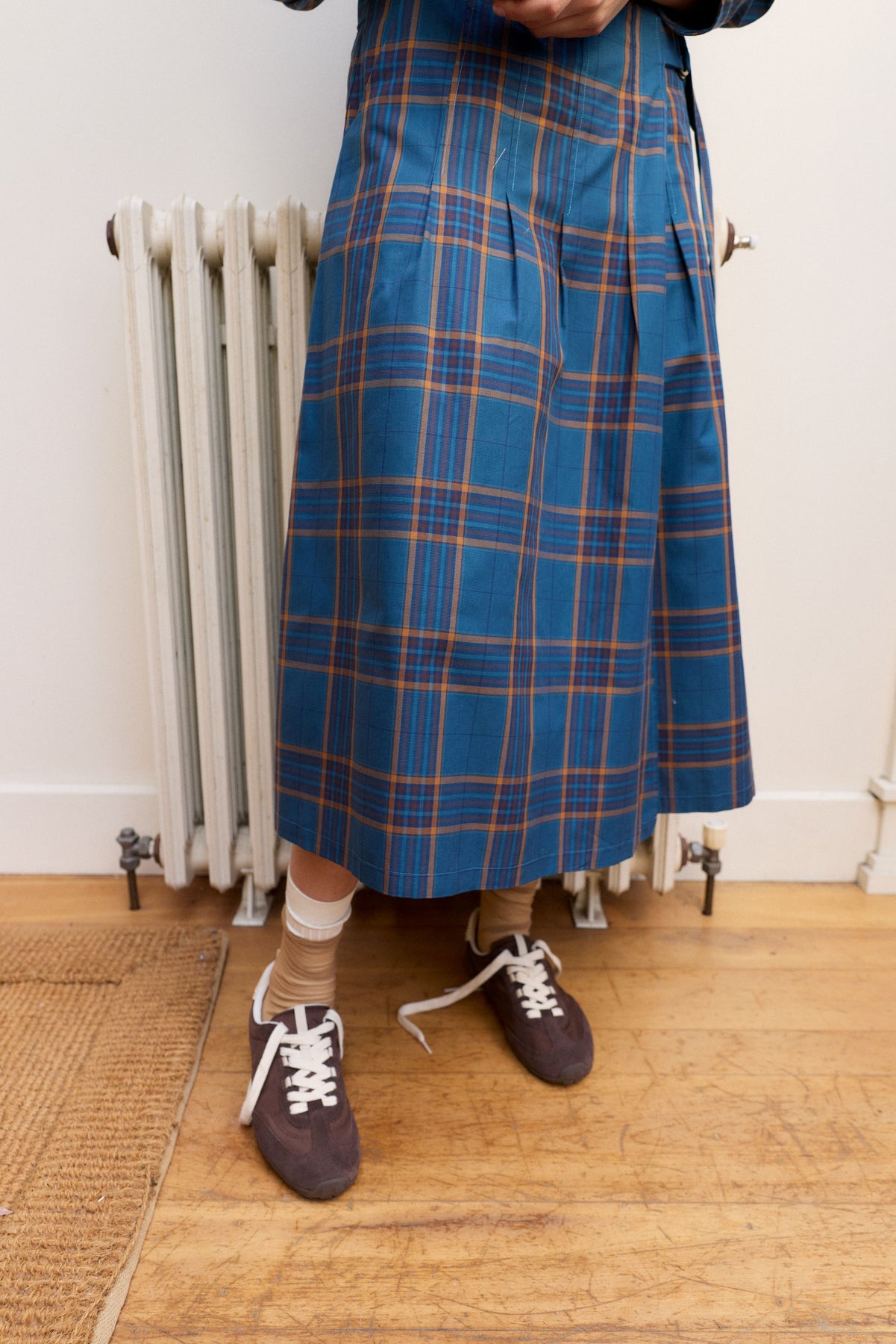 Crisp cotton pleated skirt in our Teal & Tan check for Autumn. This is a wrap skirt so the tie comes through the waist to wrap around the back and secure with the D-Ring belt loop in brass finish. This skirt is pleated from waist to the hip opens out to a midi length A-line skirt. A stunning Autumn staple