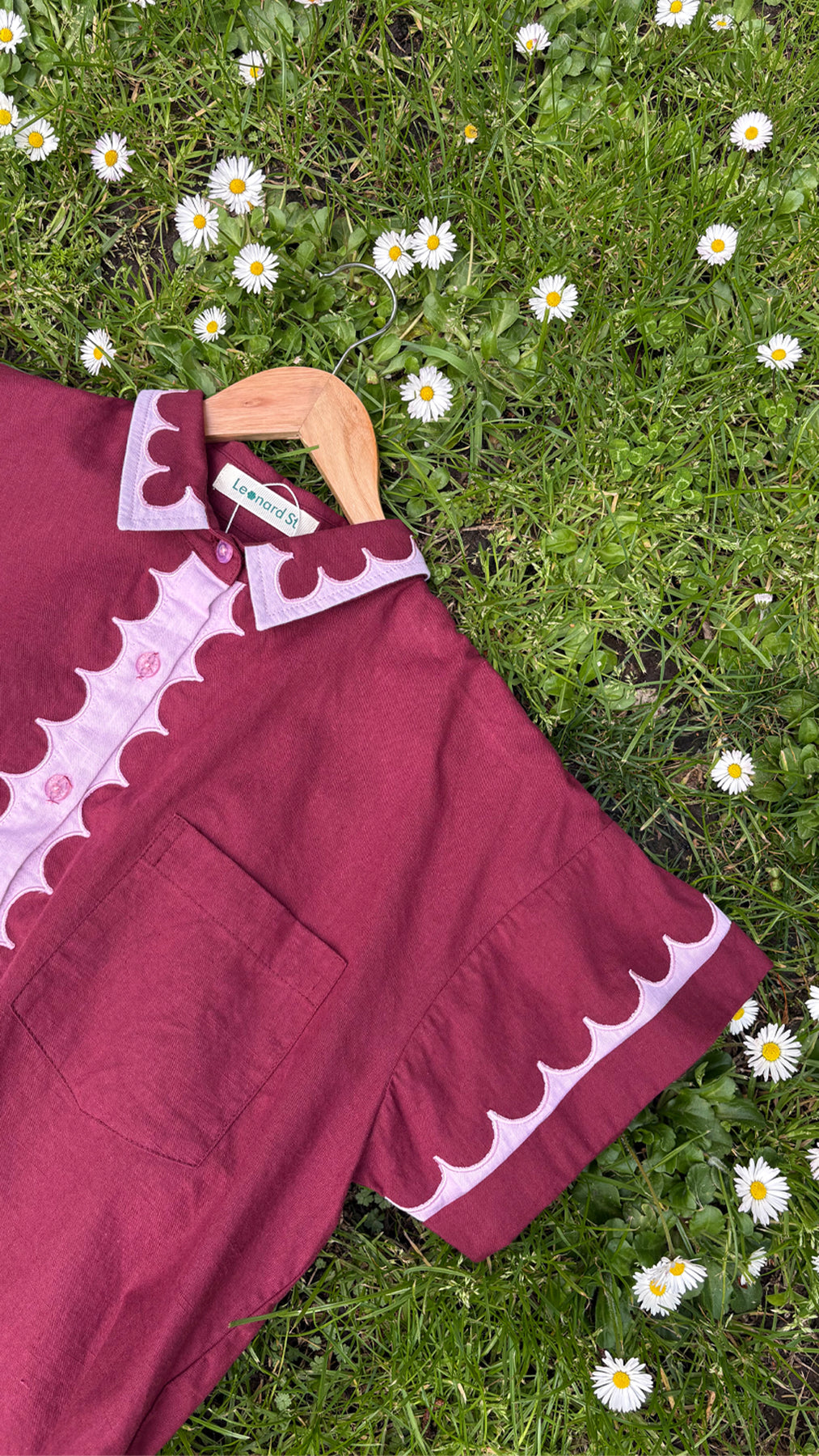 Hand crafted style in this wide cut shirt with scalloped applique and embroidered trim. A block colour statement piece, with a handcrafted finish.
