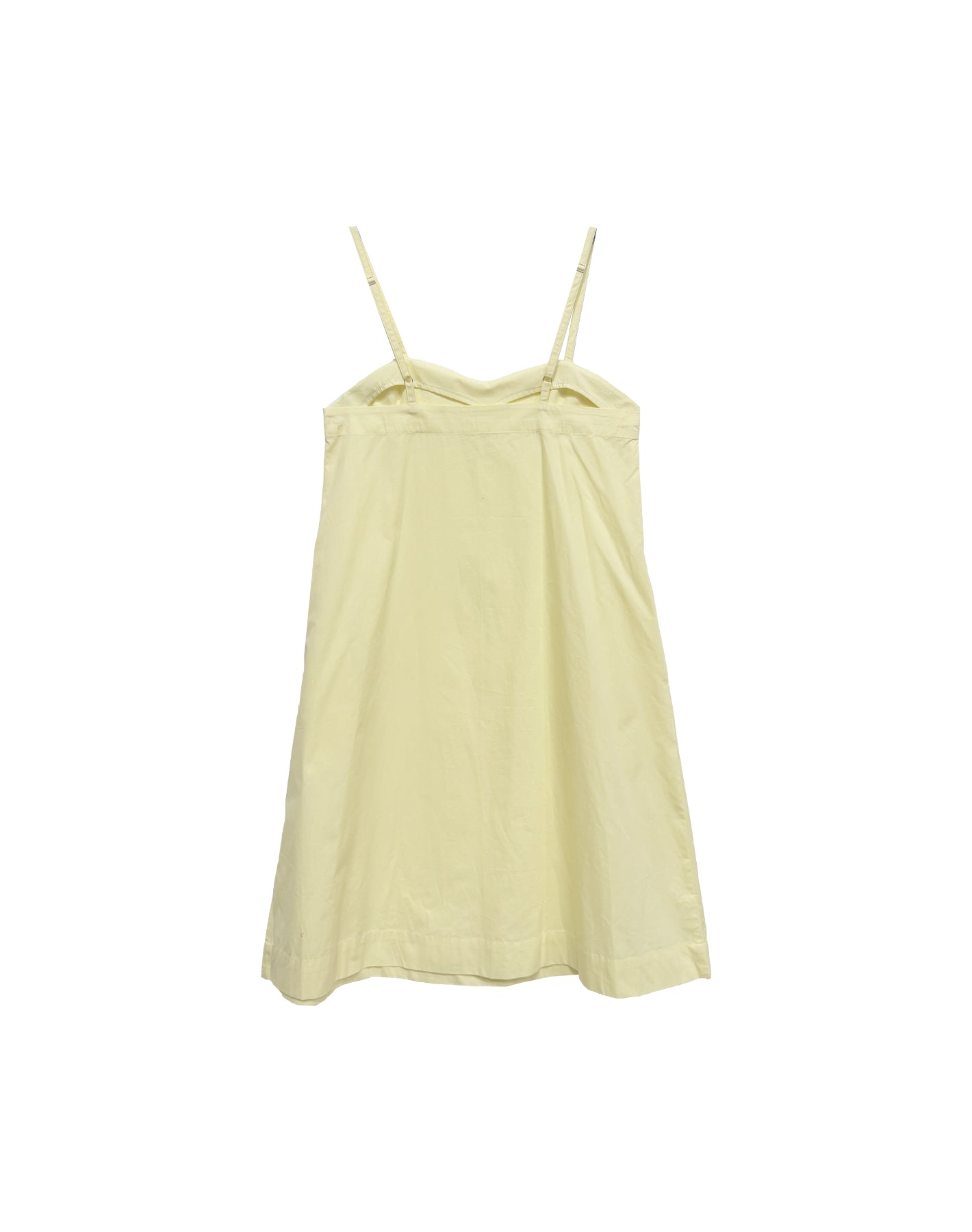 A simple A-line dress with adjustable straps, falls to the knee and features pockets at the hip. In a light weight butter yellow cotton this dress is simple and chic for summer. Layer over a tee for Spring or wear alone on warmer days.