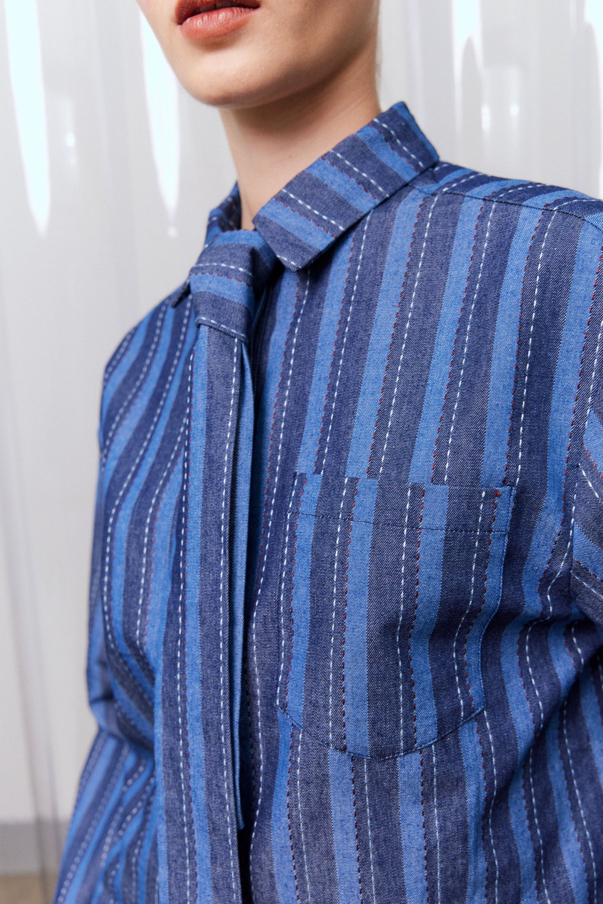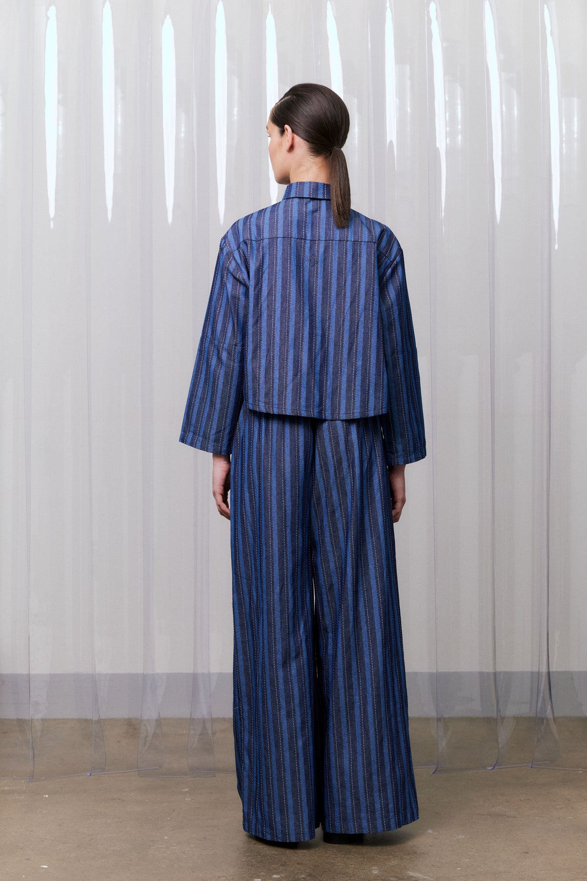 Wide cut shirt in a light weight denim fabric with a dark blue and mid blue stripe and white ticking stitch woven detailing. Wear with our matching pant or Skirt. So easy to style in this palette, its versatile to style for work and play.