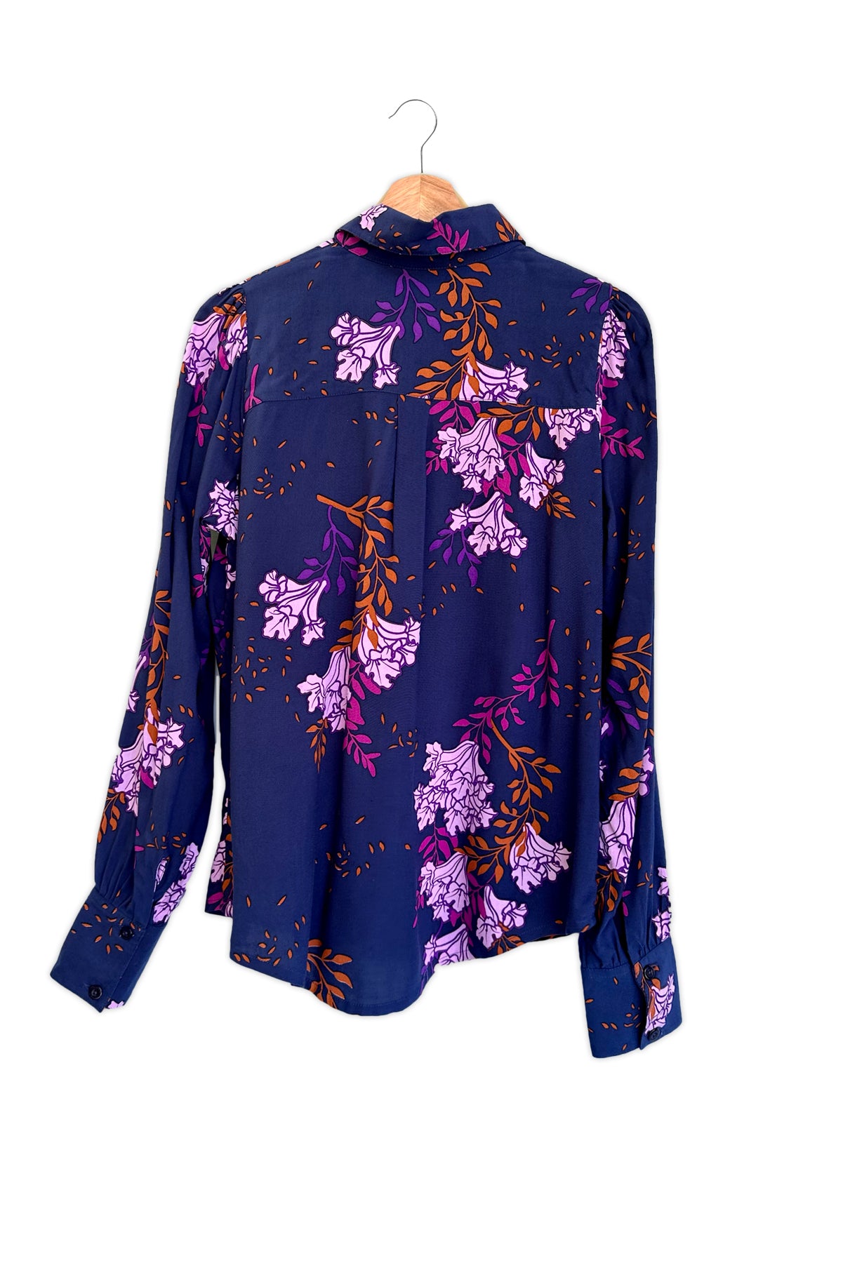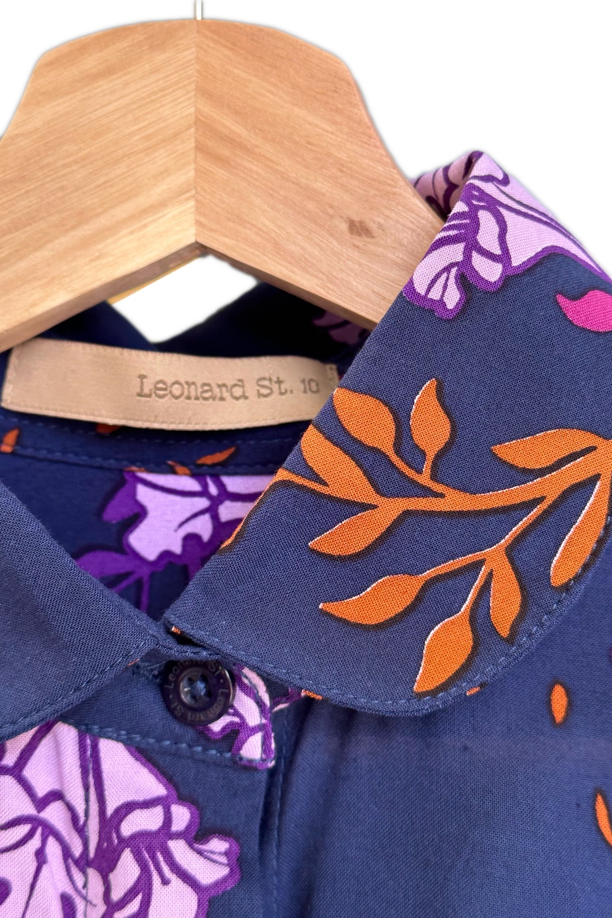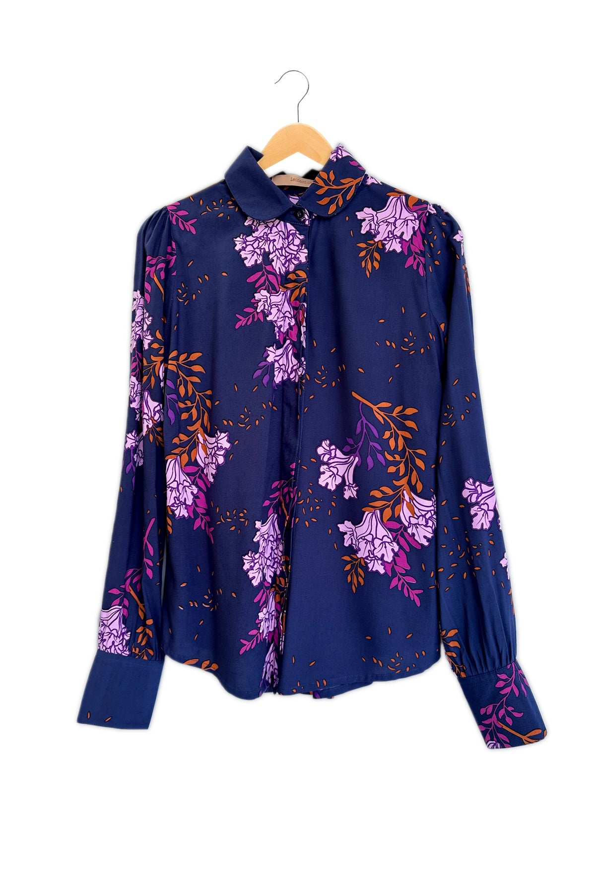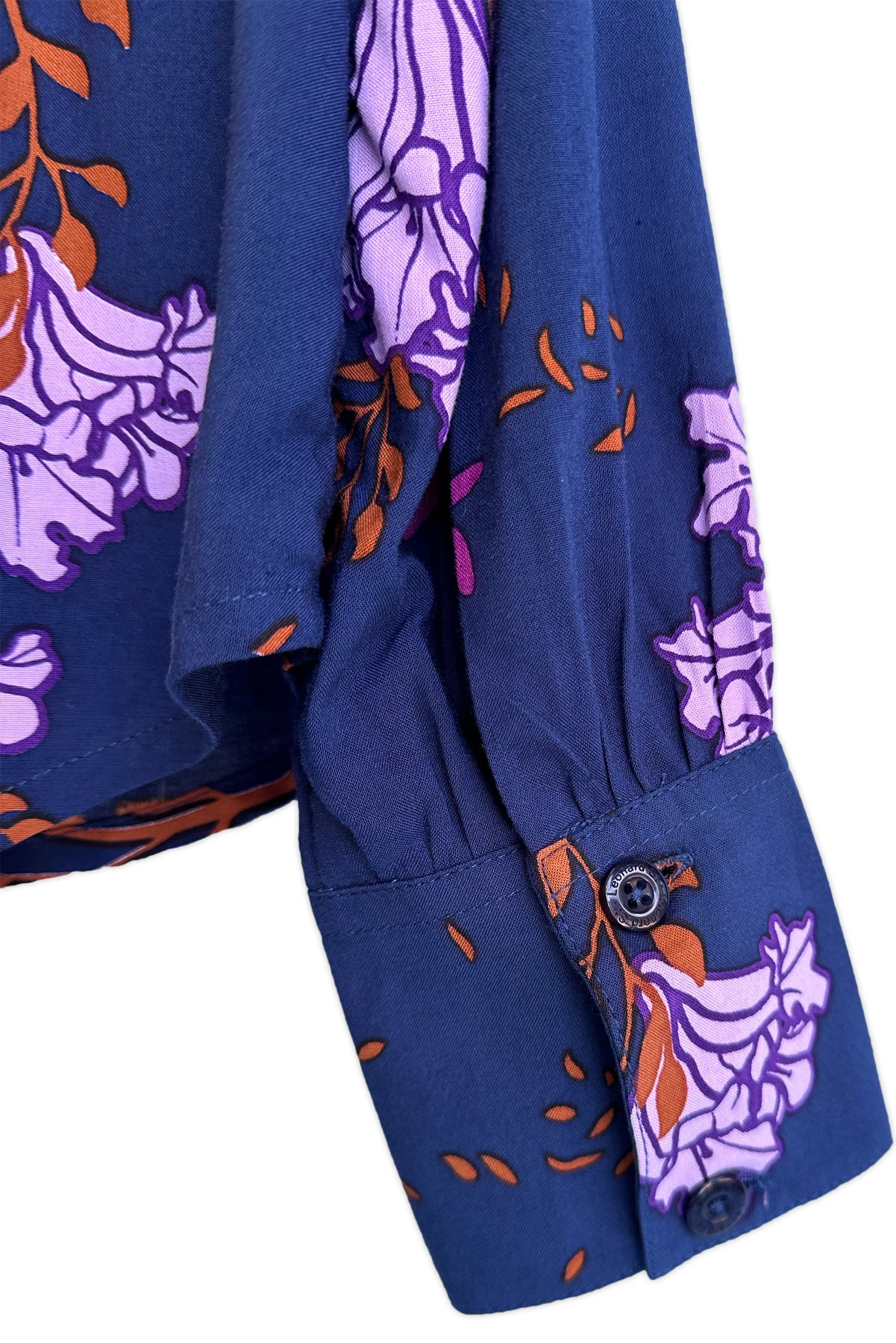 This shirt design celebrates over 20 years of original print design. Featuring the Jacaranda print on a long sleeve shirt with a round collar, yoked shoulder, slight puff at the sleeve head, set on cuffs.