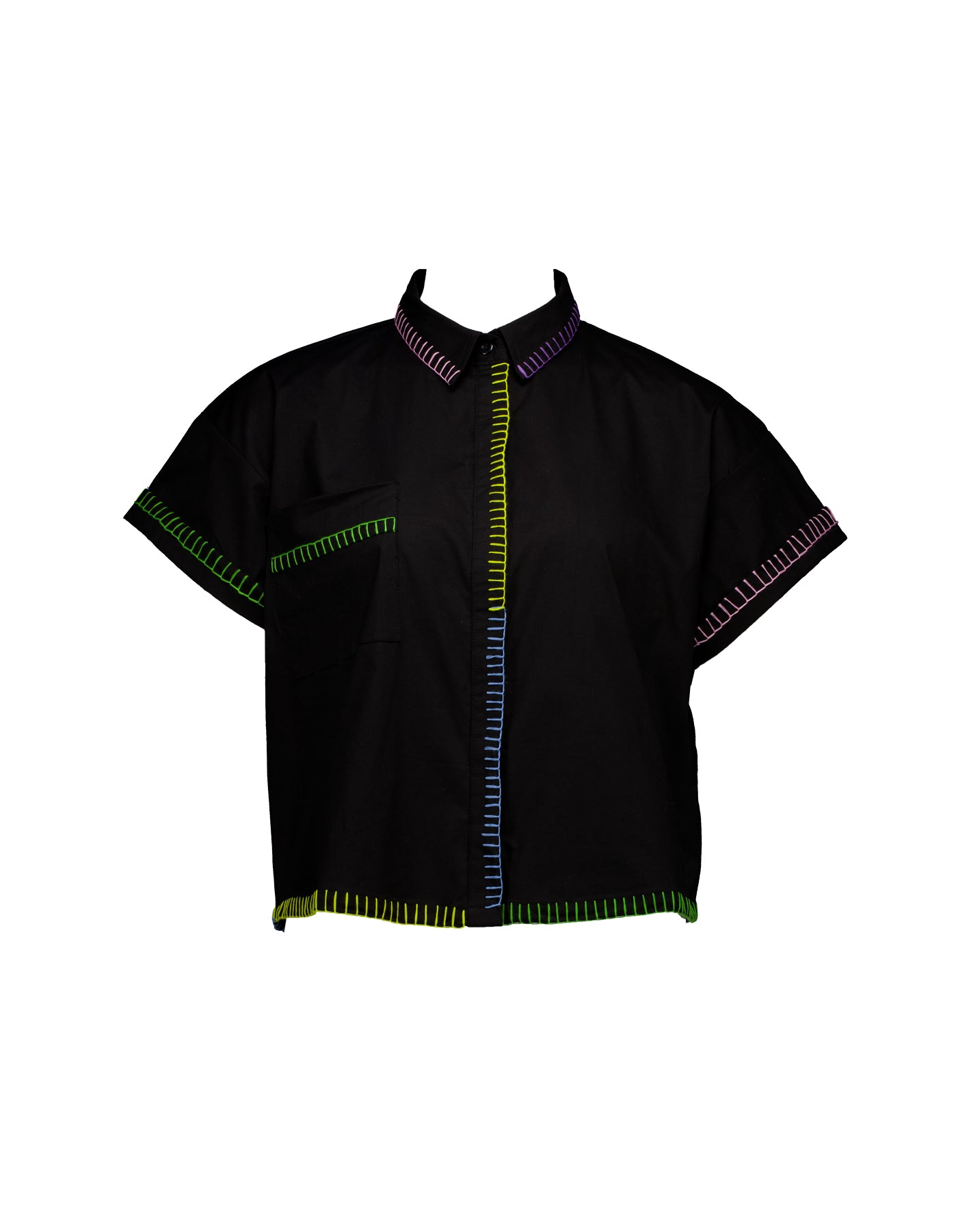 Hand crafted shirt in soft, cotton poplin with hand stitched detail multi-coloured trim. The blanket stitching has been done by hand in embroidery thread for a craft feel. The shirt is in our classic boxy cut like our Laughing Shirts. Pair back with anything. the detailed collar is a beautiful touch poking out from any neckline.