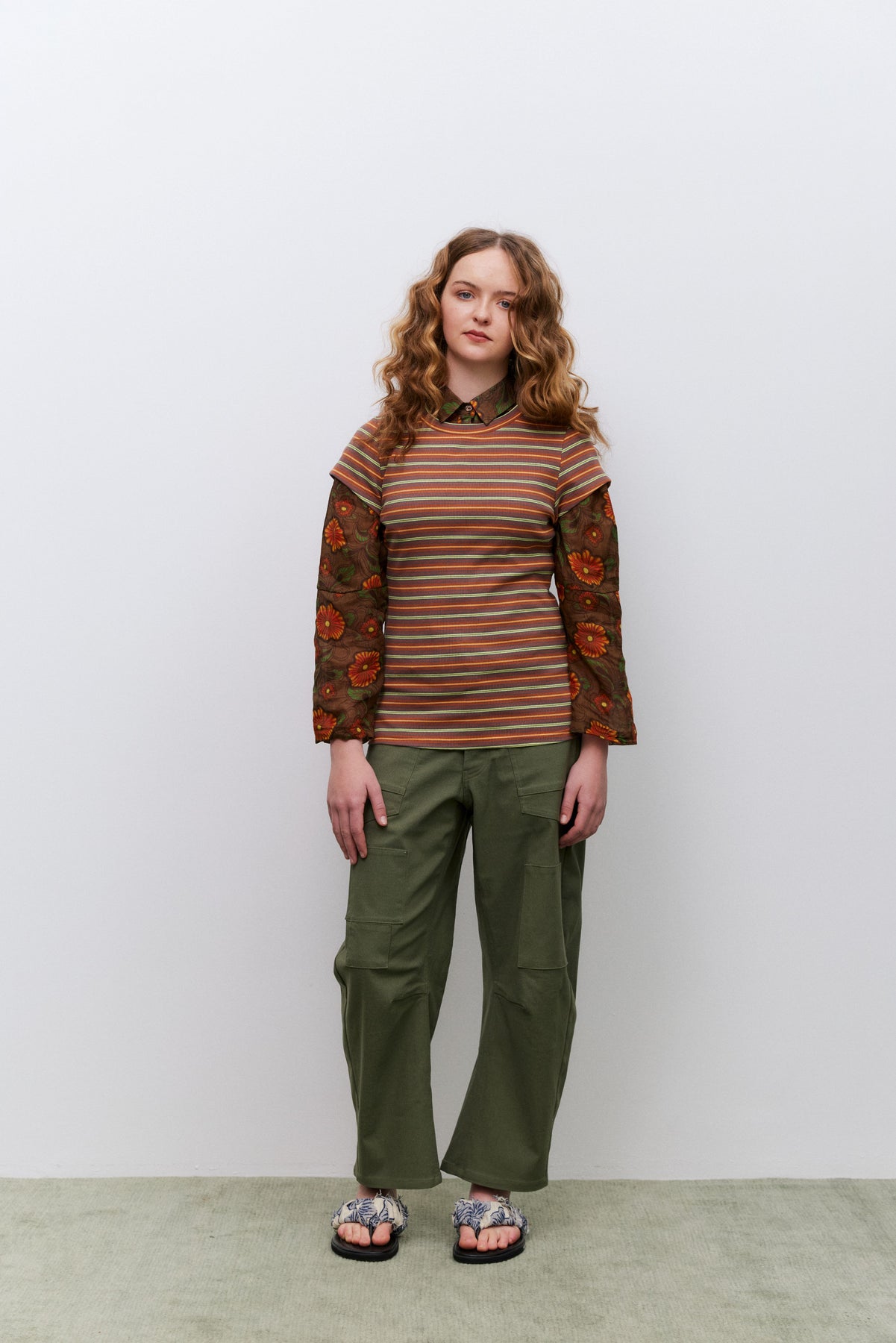 Styled with the Column Skirt Denim, under the Peanuts Stripe Tee and Applique Pant, Olive