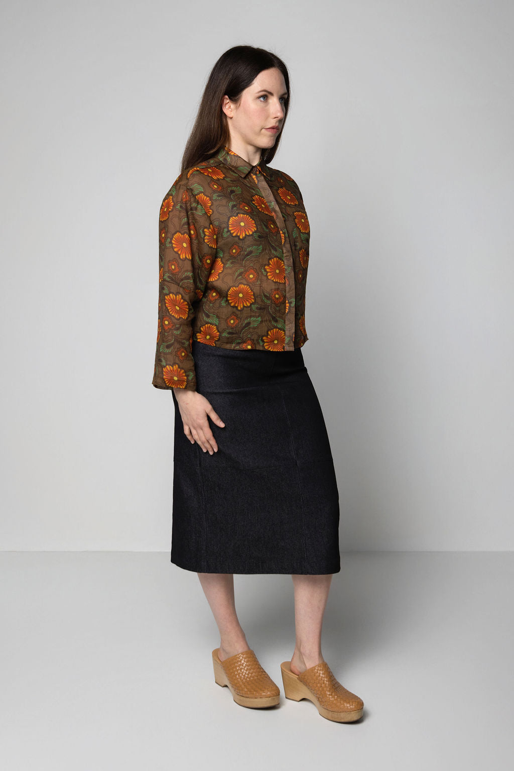 Stunning retro floral in delicious brown base with orange flowers and swirling green leaves. A very 1975 floral, reminding me of childhood holidays spent at the old beach house. Reimagined in a stunning slippery linen cloth for this Spring. This shirt features a square collar, loose body and long sleeves.