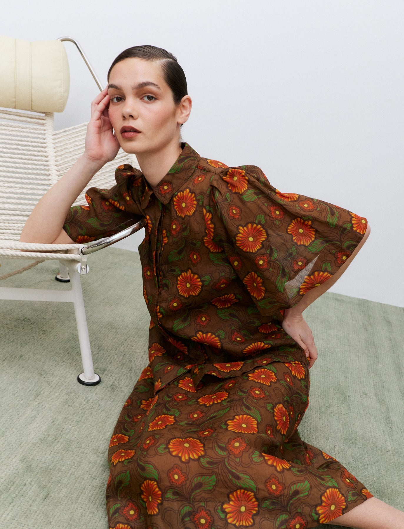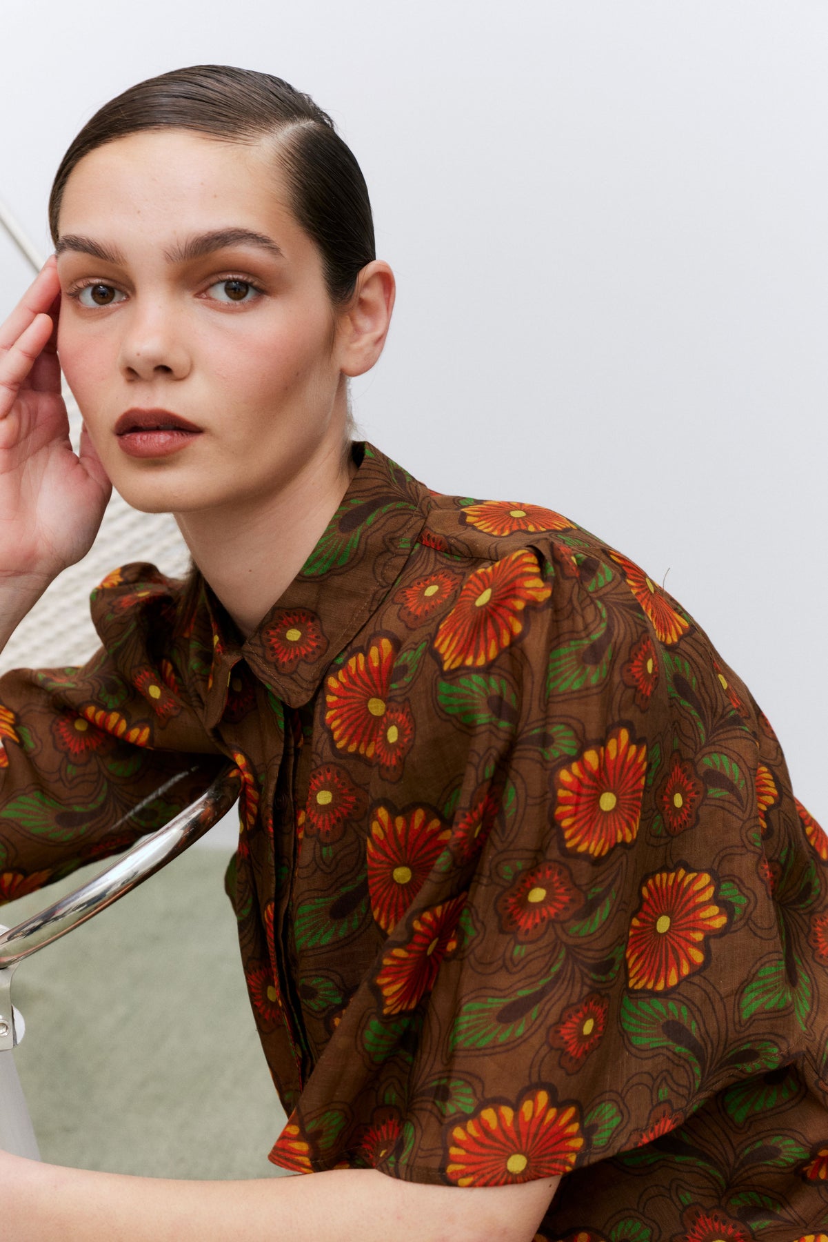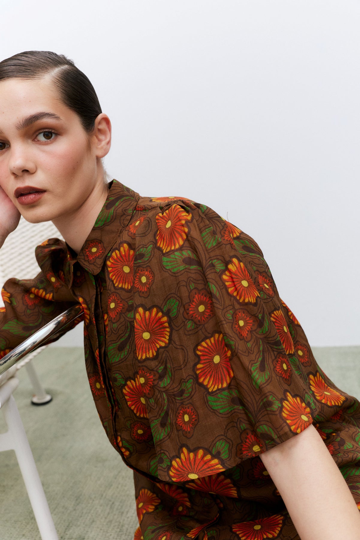 Stunning retro floral in delicious brown base with orange flowers and swirling green leaves. A very 1975 floral, reminding me of childhood holidays spent at the old family beach house. Reimagined in a stunning slippery linen cloth for this Spring. A beautiful fine linen button up shirt with full statement sleeves.