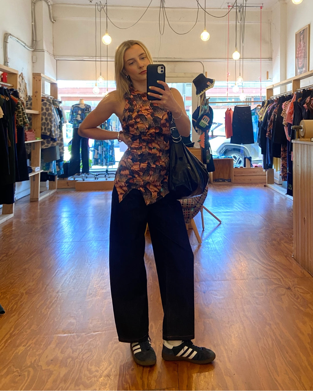Styled with the Indigo Rib Cage Manhattan Pant, Barrel Leg Denim Jean and Phoebe Bag in Black