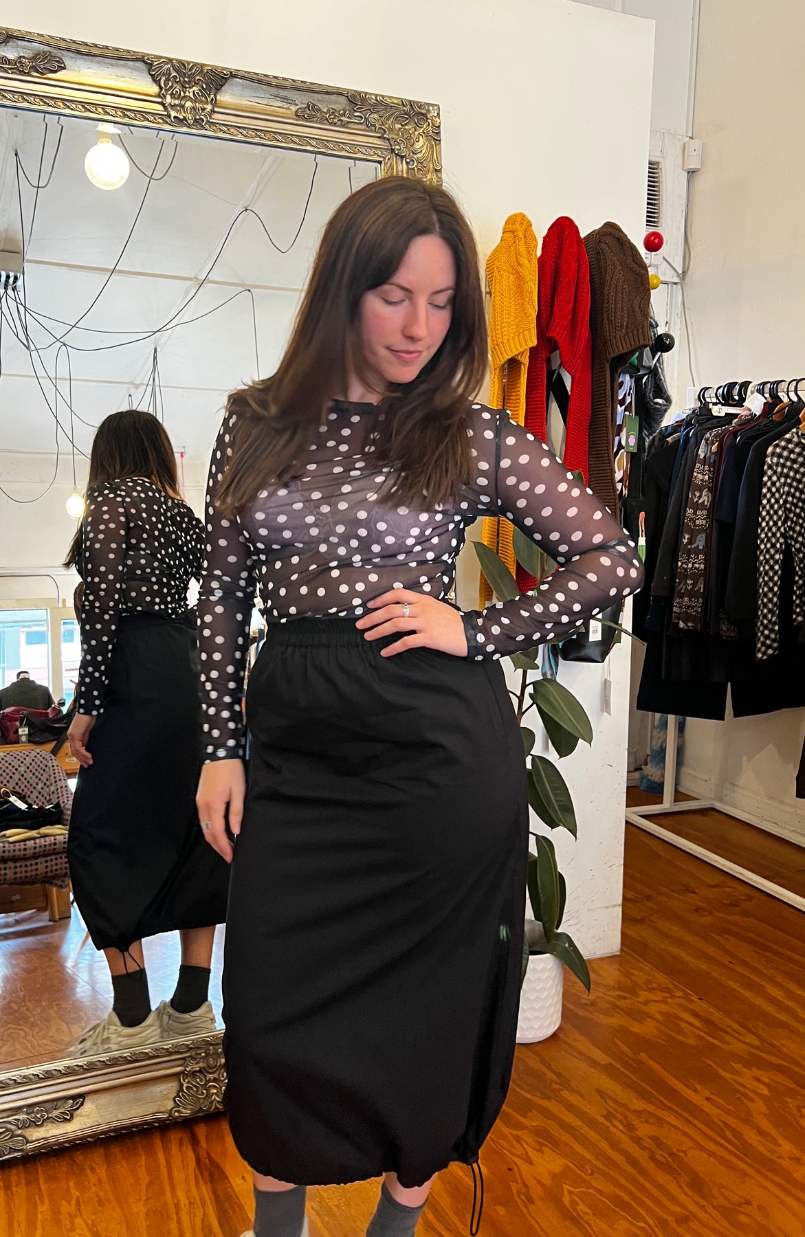 Styled here with the Bubble Tea Top long sleeve, Knitting Circle Scarf in Orange, Cocoon Drill Pant, INXS top, & Seersucker Top, Petal Astro Top, Petal Scarf and Polka Mesh Top in Black