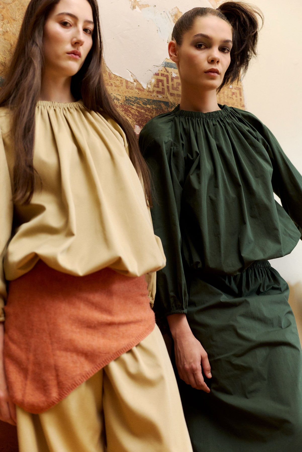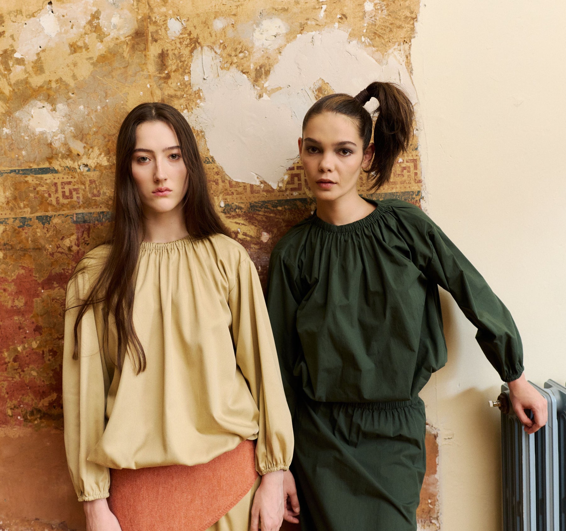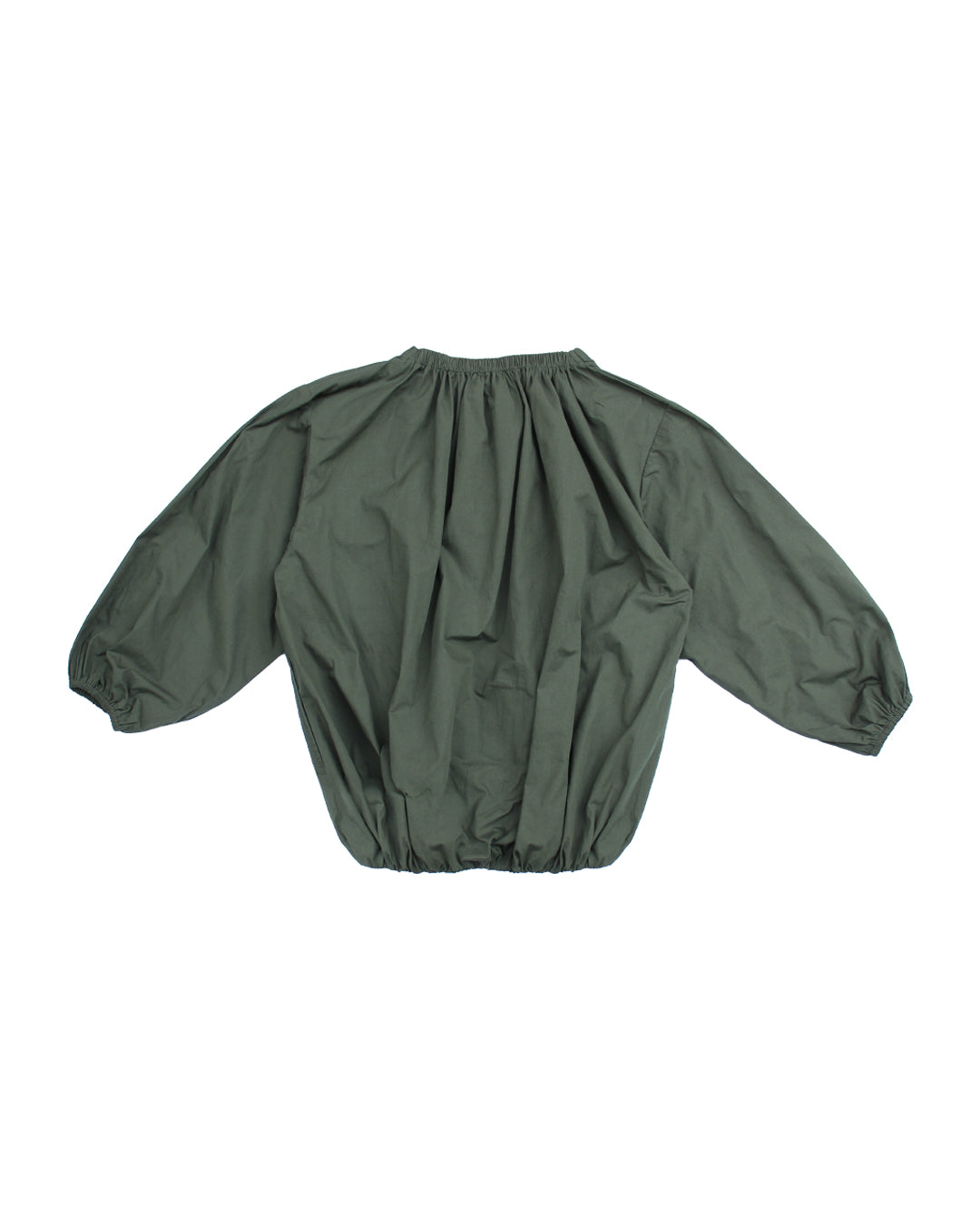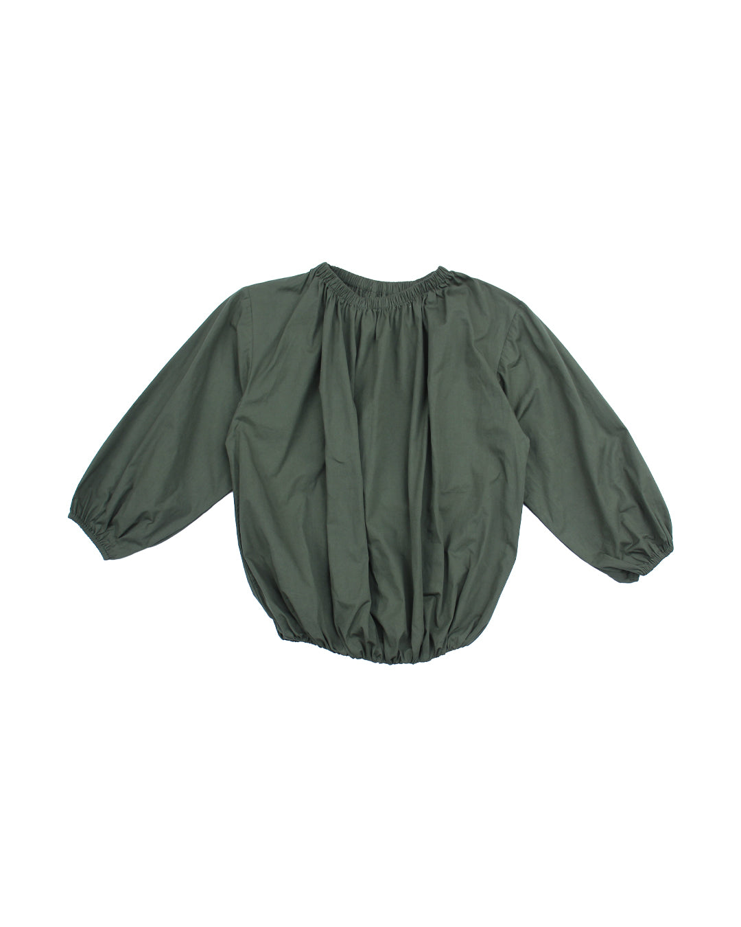 Super cute and directional top with a bubble hemline and gathered neckline in Stone or Green. A balanced combination of drape and structure. Elasticated at the waist and longer in the body so you can adjust where it sits on waist or hips and style as liked and long sleeves for Autumn days.
