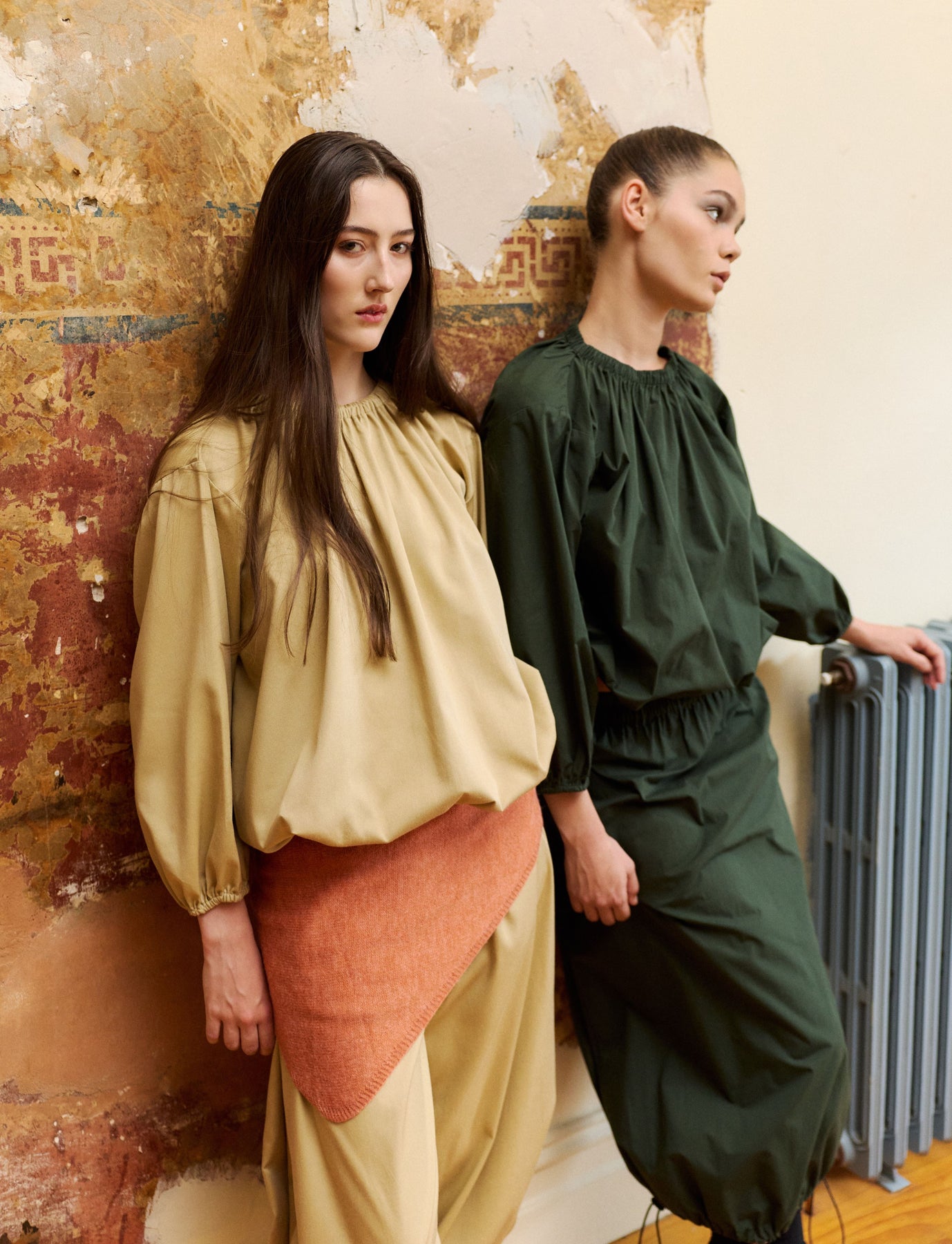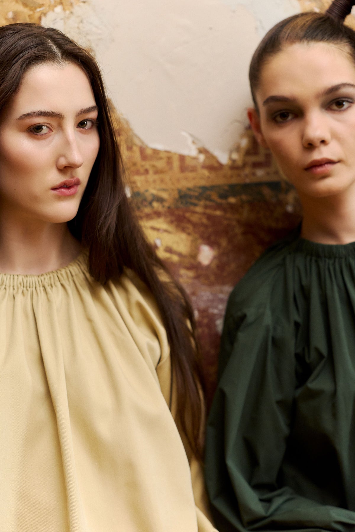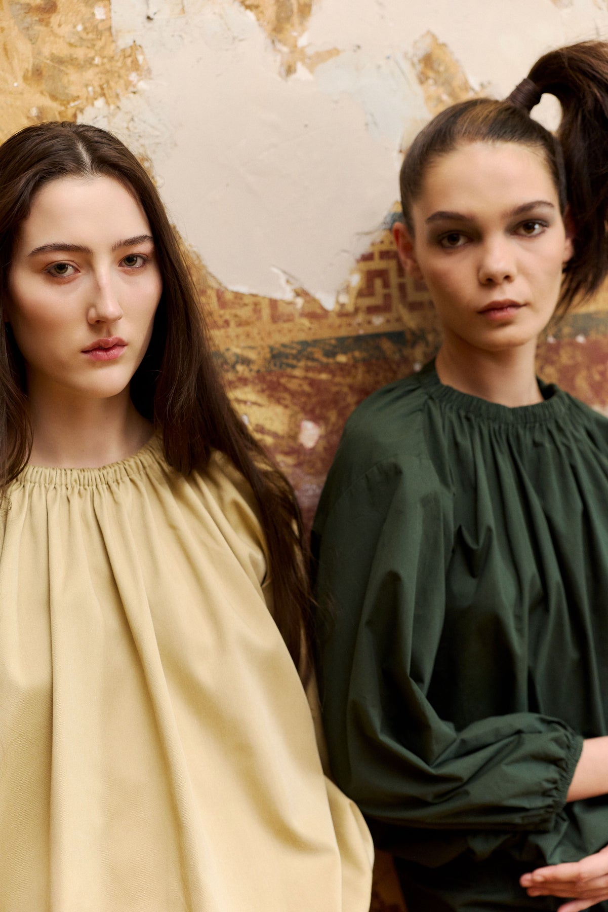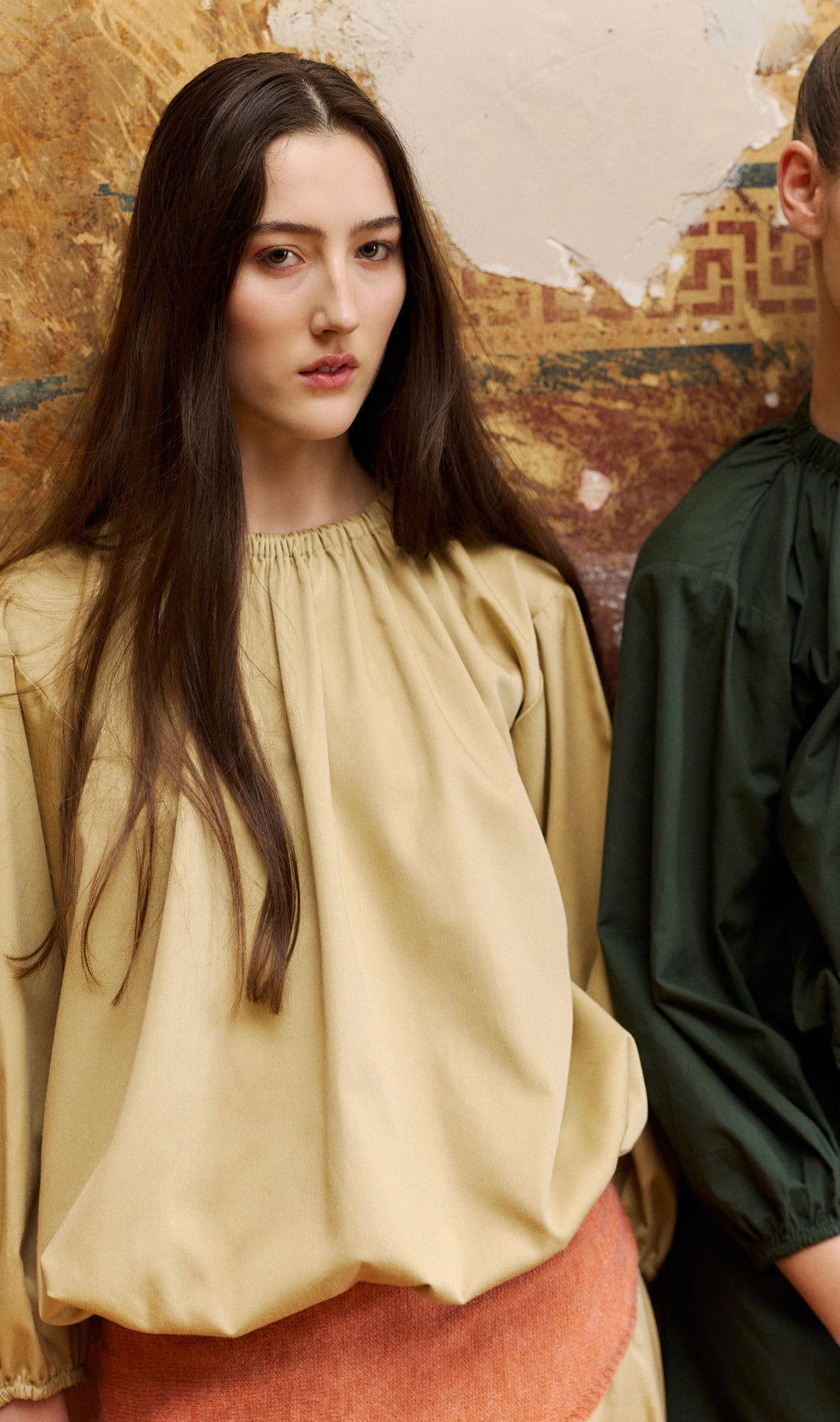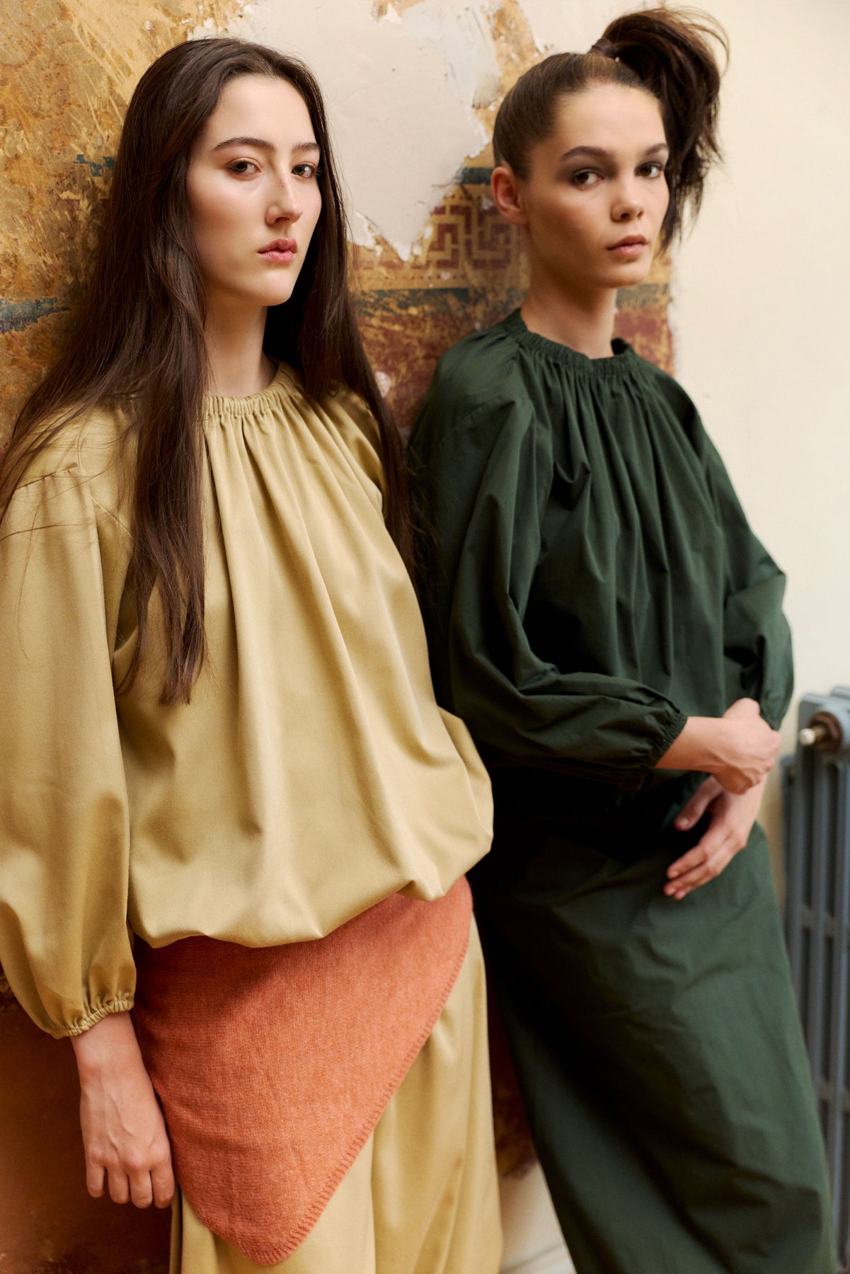 Super cute and directional top with a bubble hemline and gathered neckline in Stone or Green. A balanced combination of drape and structure. Elasticated at the waist and longer in the body so you can adjust where it sits on waist or hips and style as liked and long sleeves for Autumn days.
