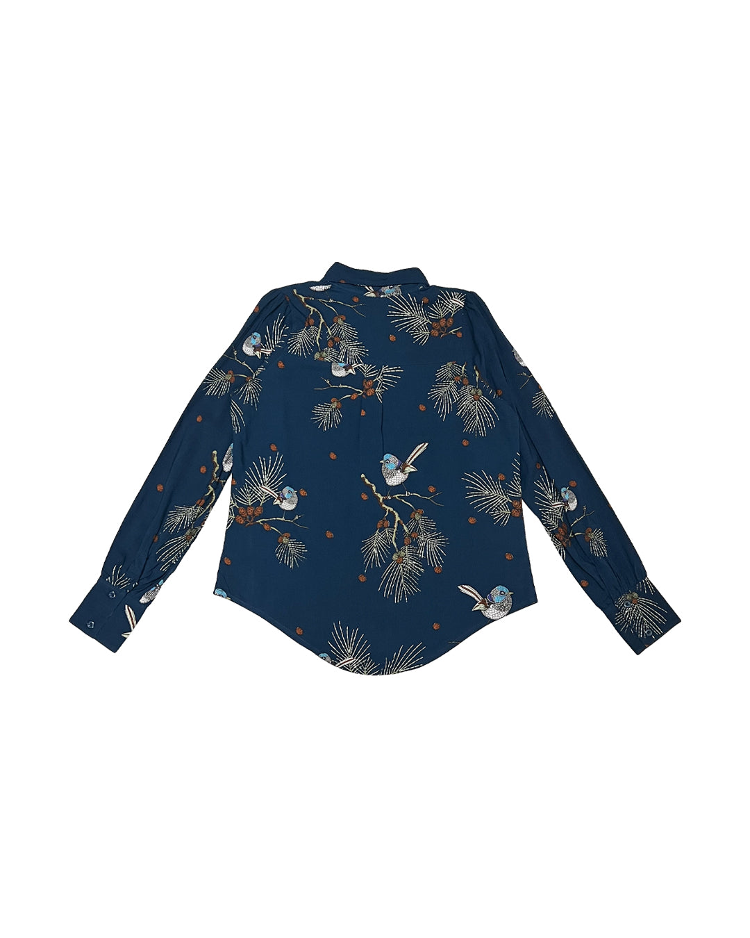 Classic long sleeves shirt in our Wren print in Navy petrol base. Featuring the beautiful Fairy Wren. This shirt features a wing collar, a single breast pocket and lovely long cuffs.