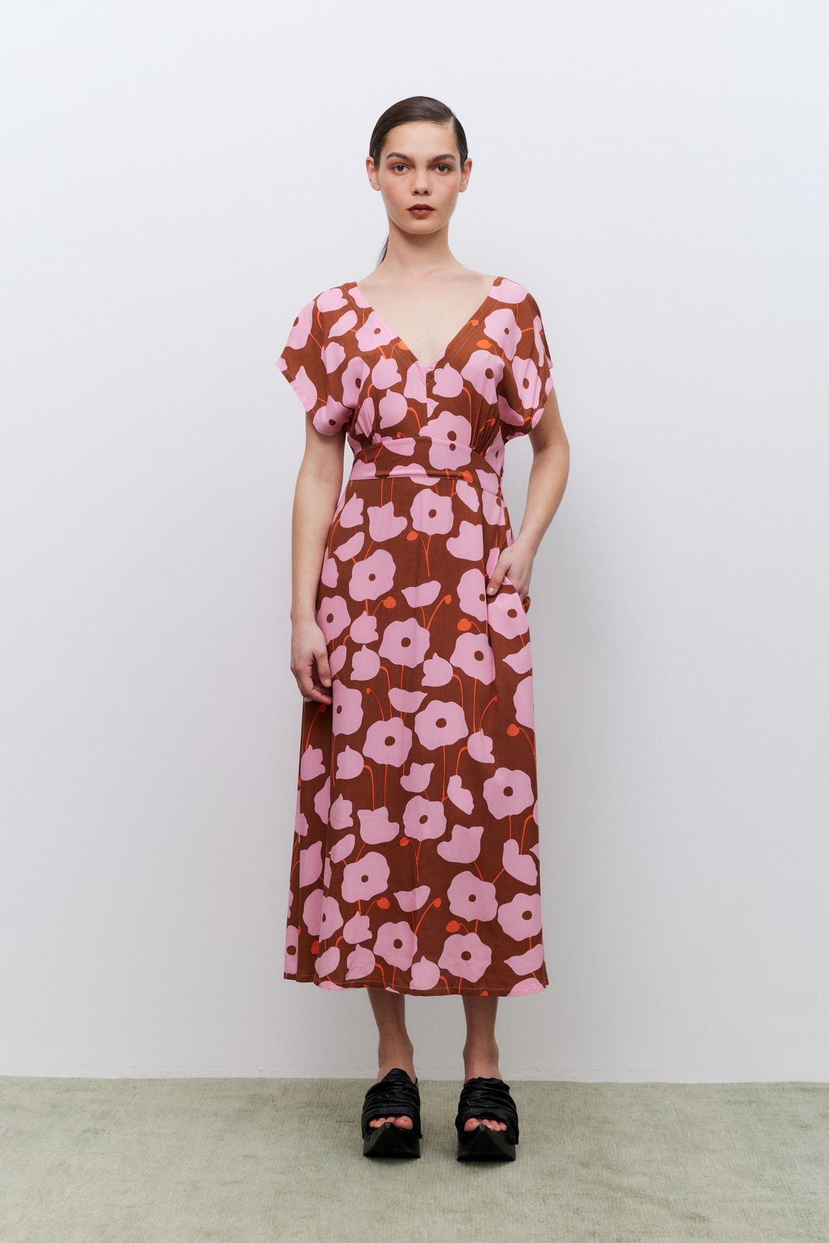 A deep V-neckline, with wide sleeves and set on a curved waistband and and an A-line skirt, it's super flattering on. This dress can styled up or down for day or night. Delicious new palette for Spring 2025 brown, pink and red.