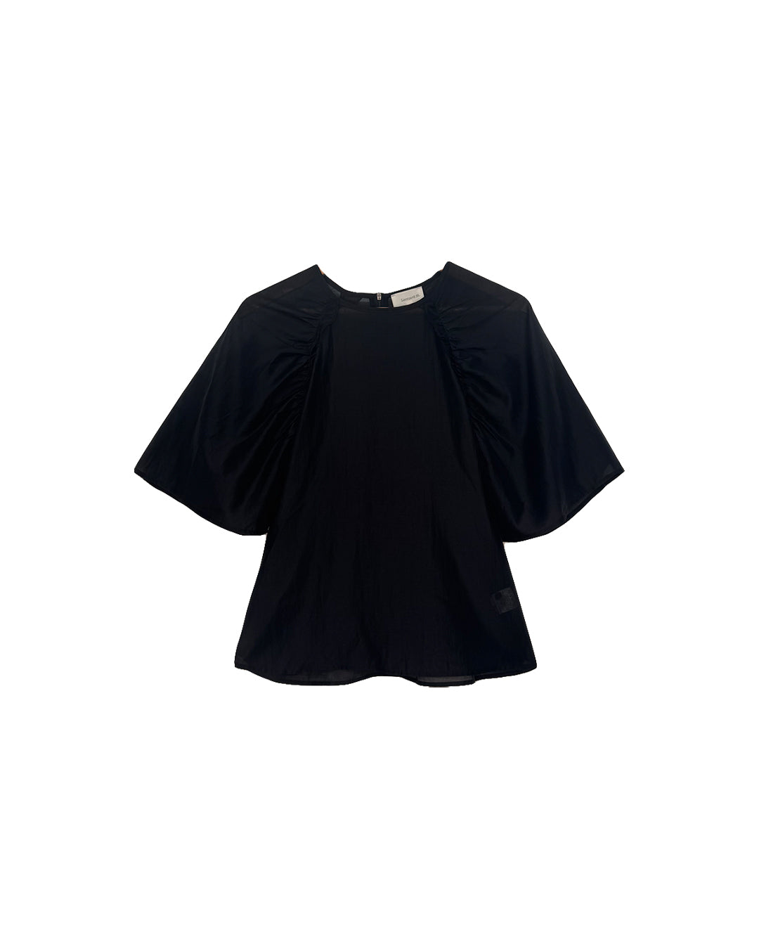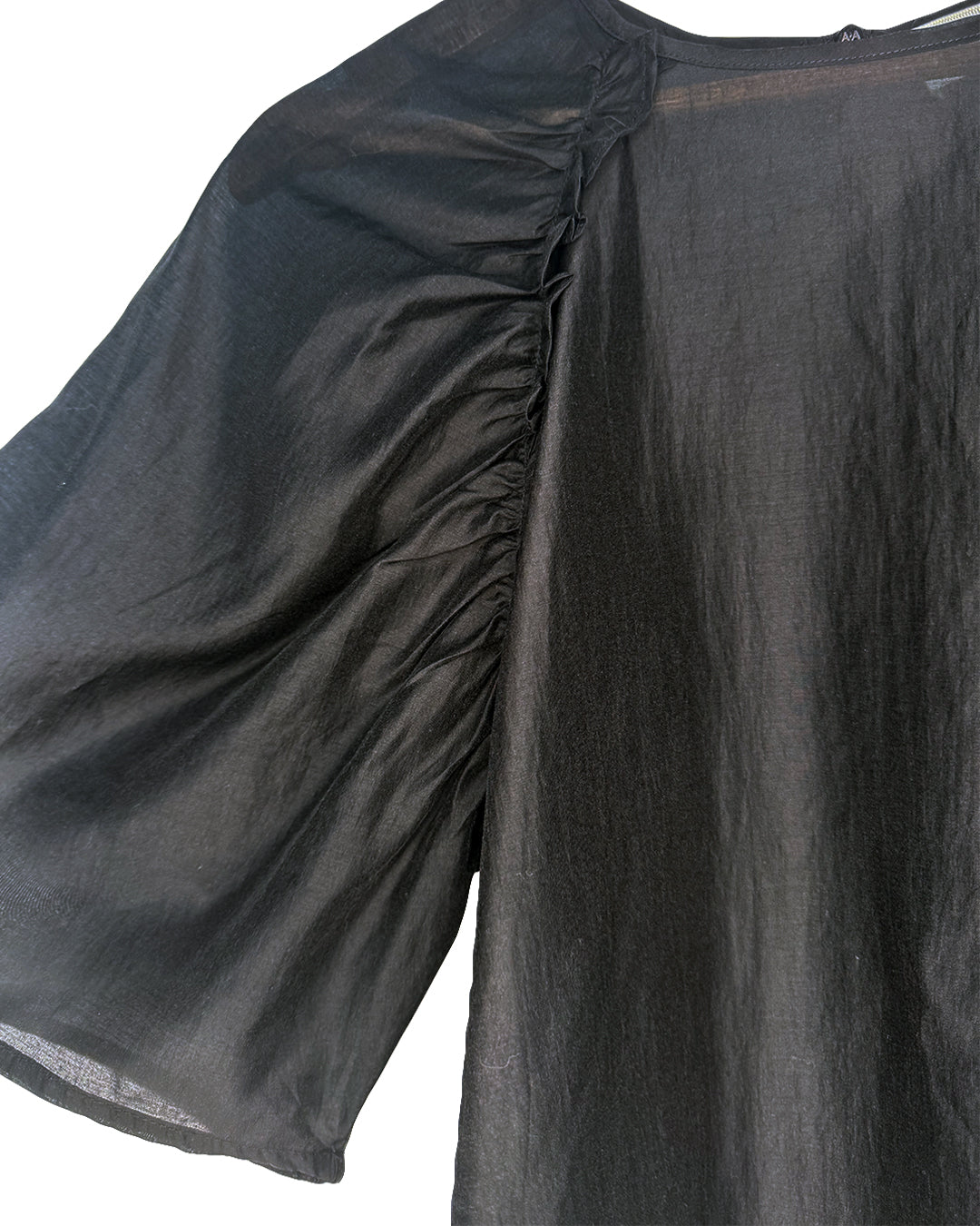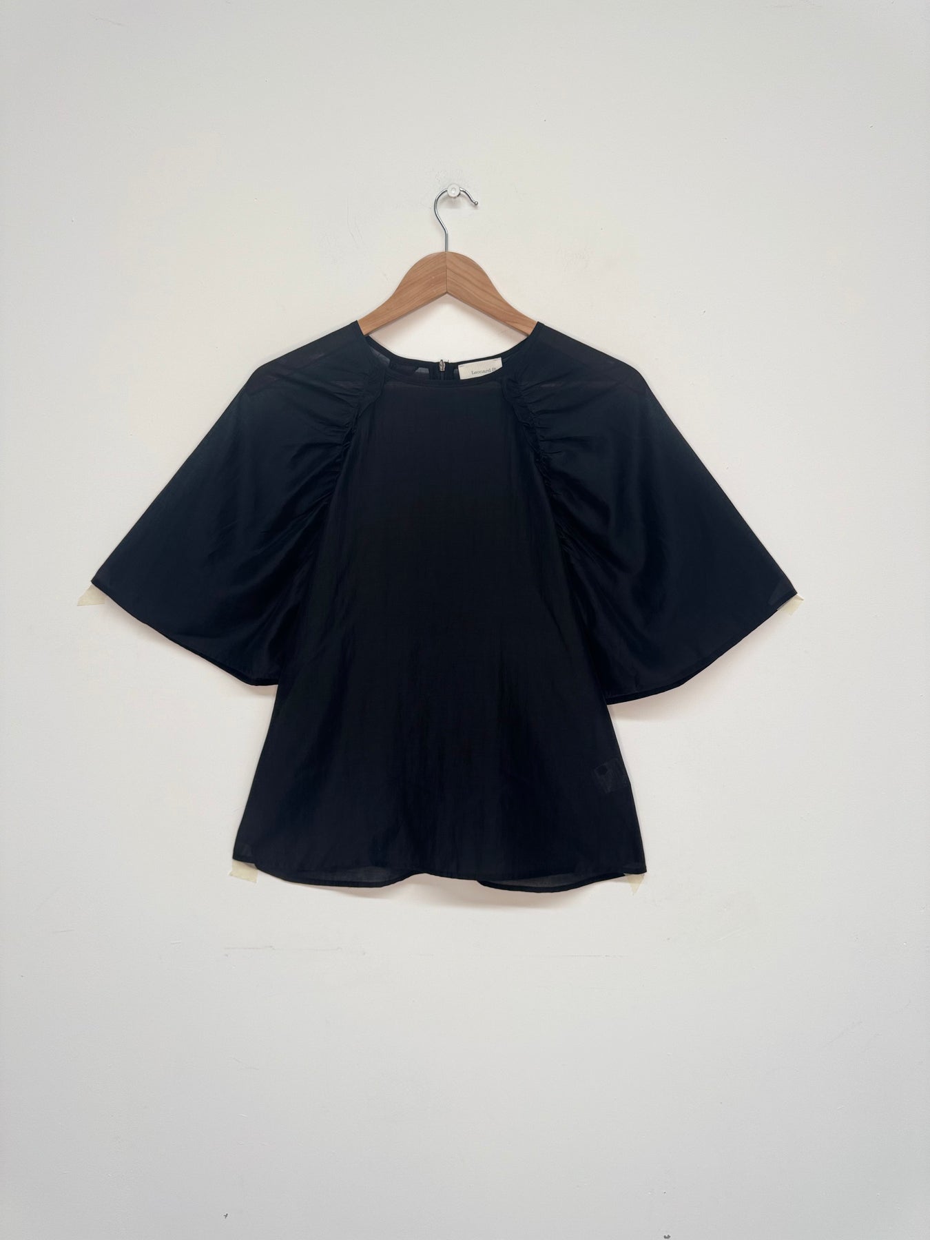 Beautiful sheer top with raglan wing sleeve with ruffles at the raglan front and back and cuff. This top brings modern elegance to any look, with an invisible zip at centre back and set on cuffs with a button and keyhole. In beautiful tencel woven cloth.