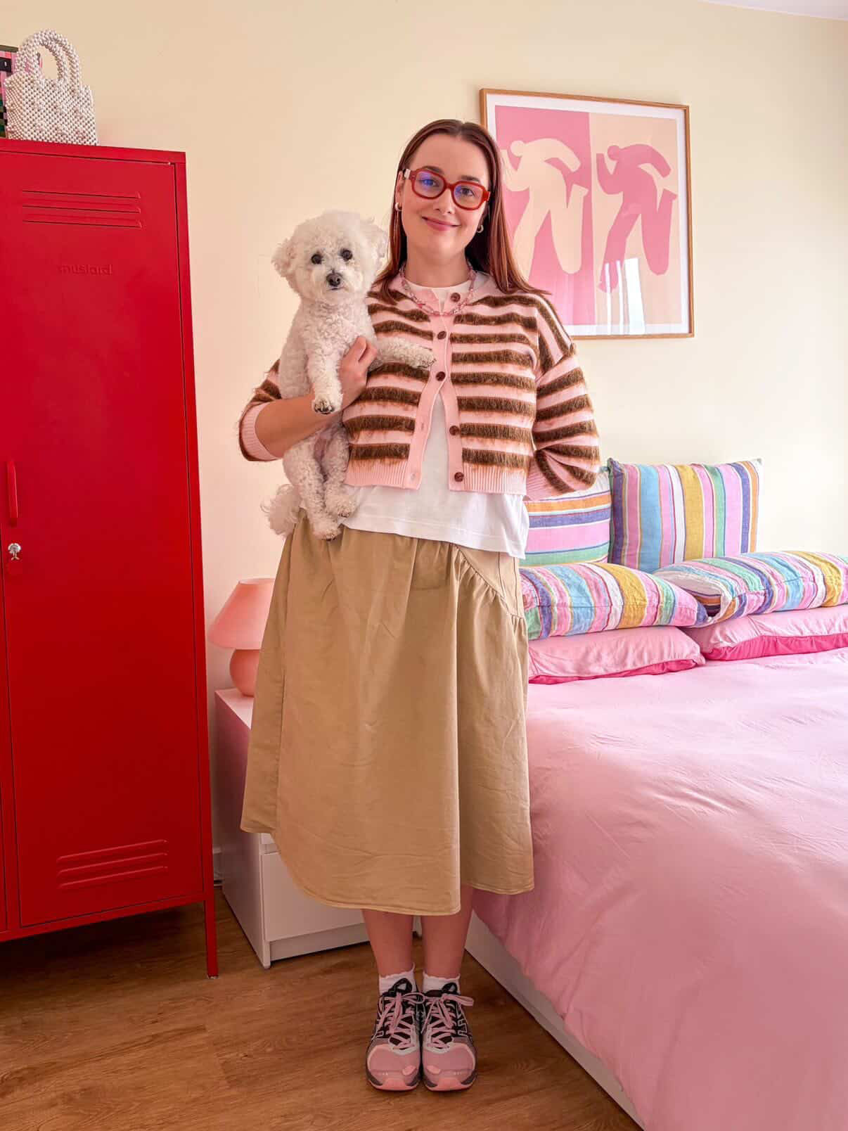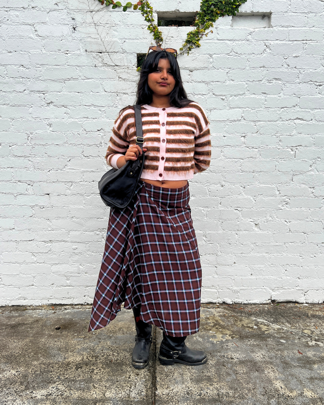 Person wearing A striped cardigan in pale pink and brown with brown buttons and a dropped shoulder design with 3/4 sleeves, black jeans and a red belt against a fence with plants