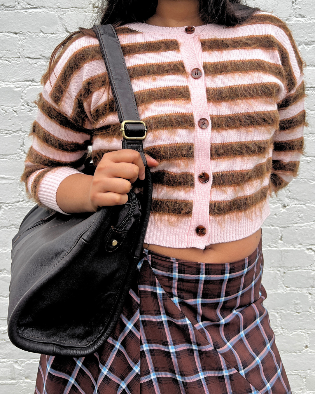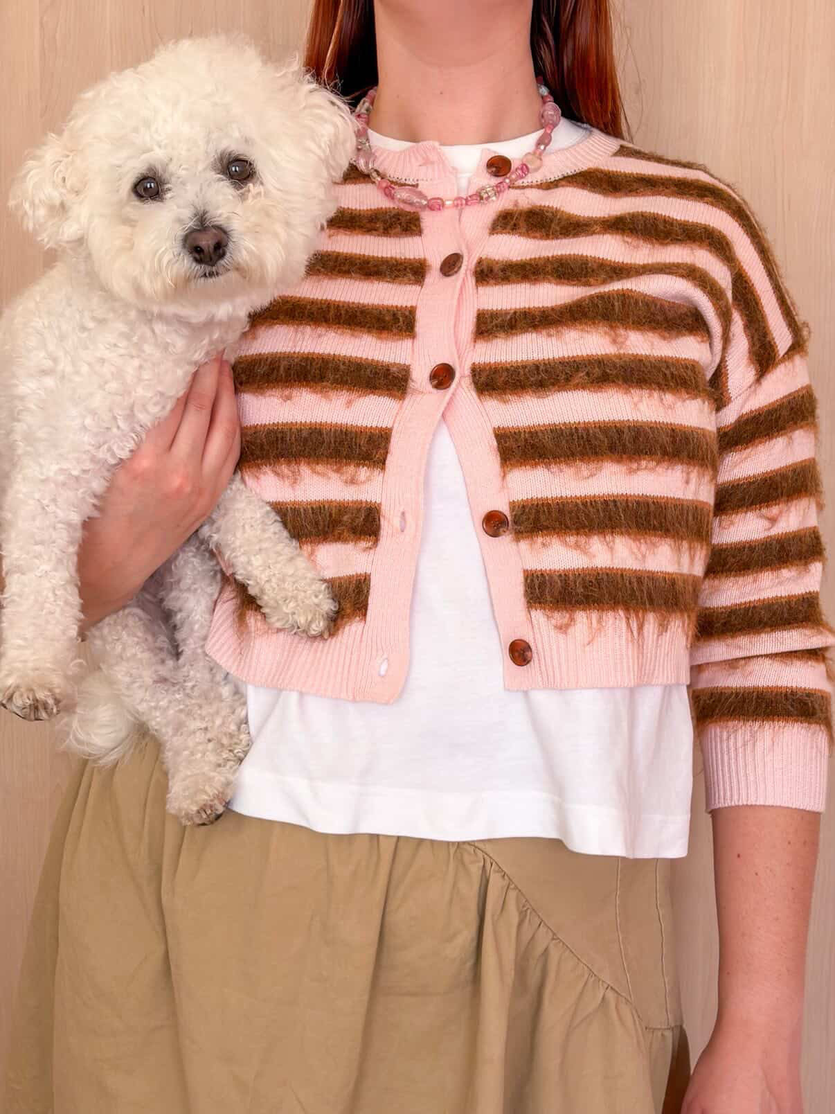 Super soft striped cardigan in pale pink and fuzzy brown, with a dropped shoulder and cropped sleeve, and faux tortoise shell buttons.