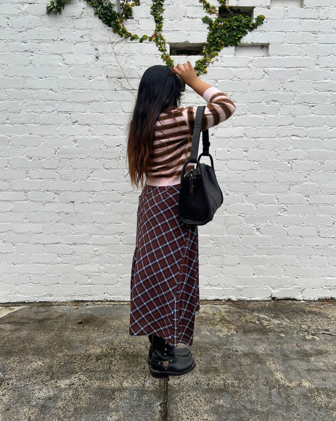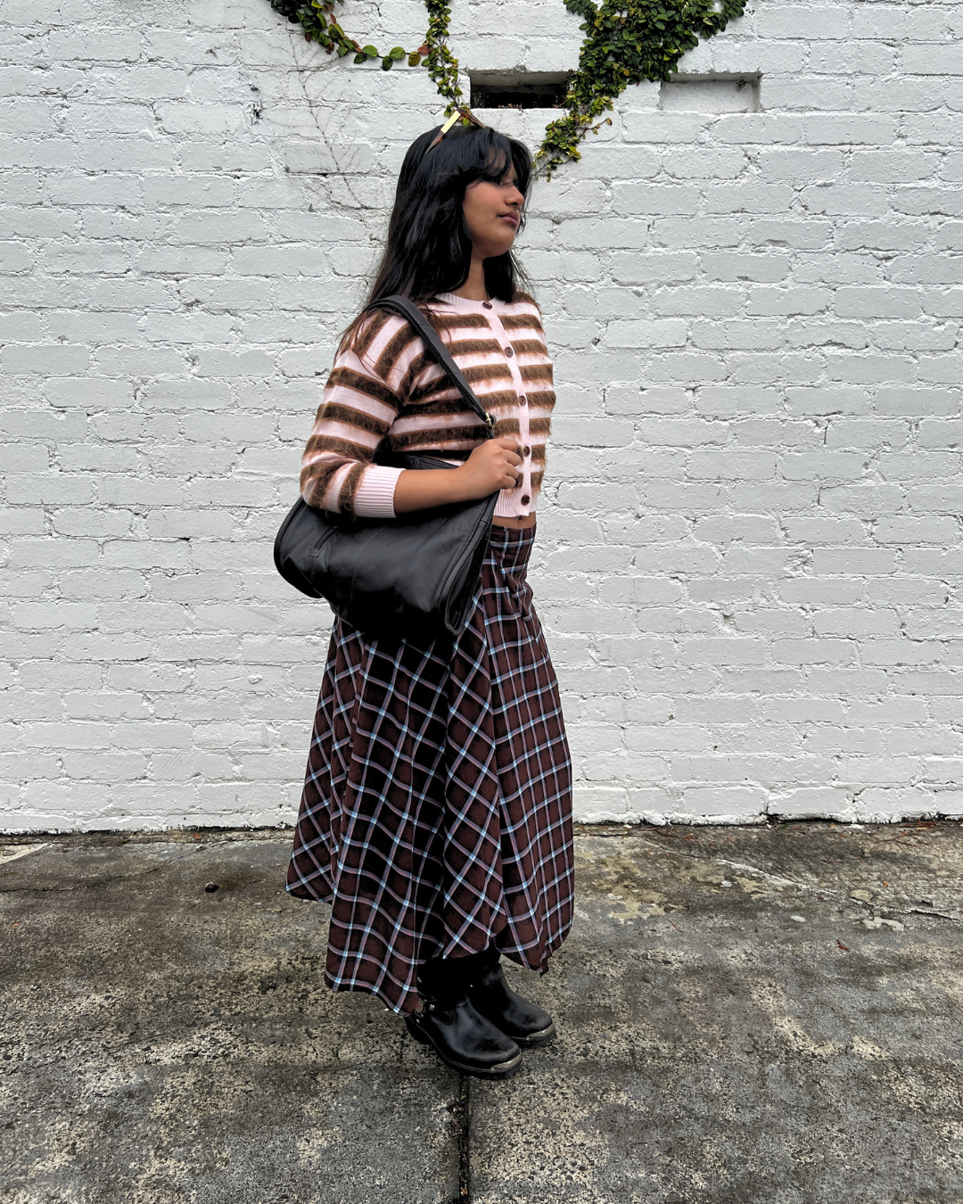 Styled with the Grandmaster Skirt, Phoenician Tote, New Flares in Black, Suede Belt, Barrel Suede Pant and Cashmere Jacket and the Hebrides Skirt