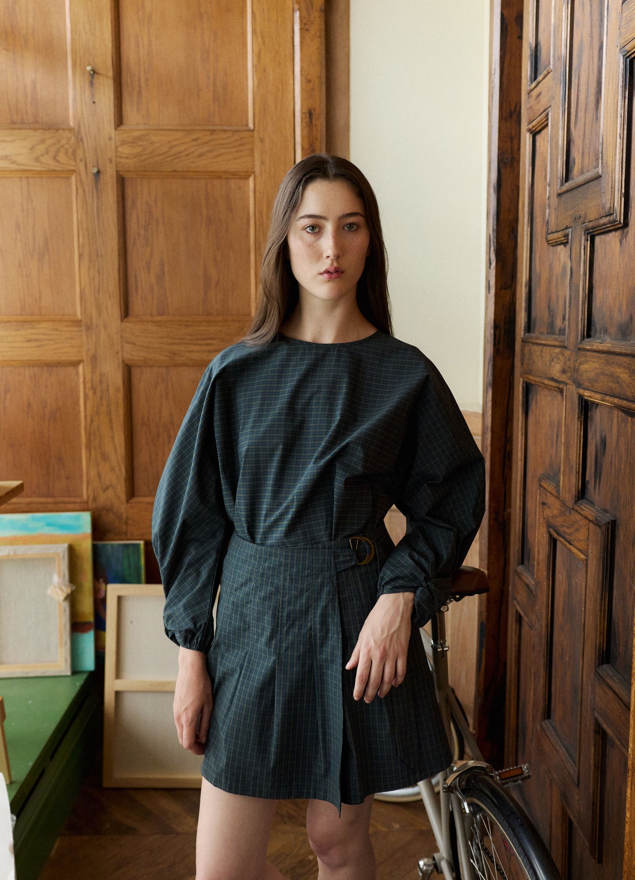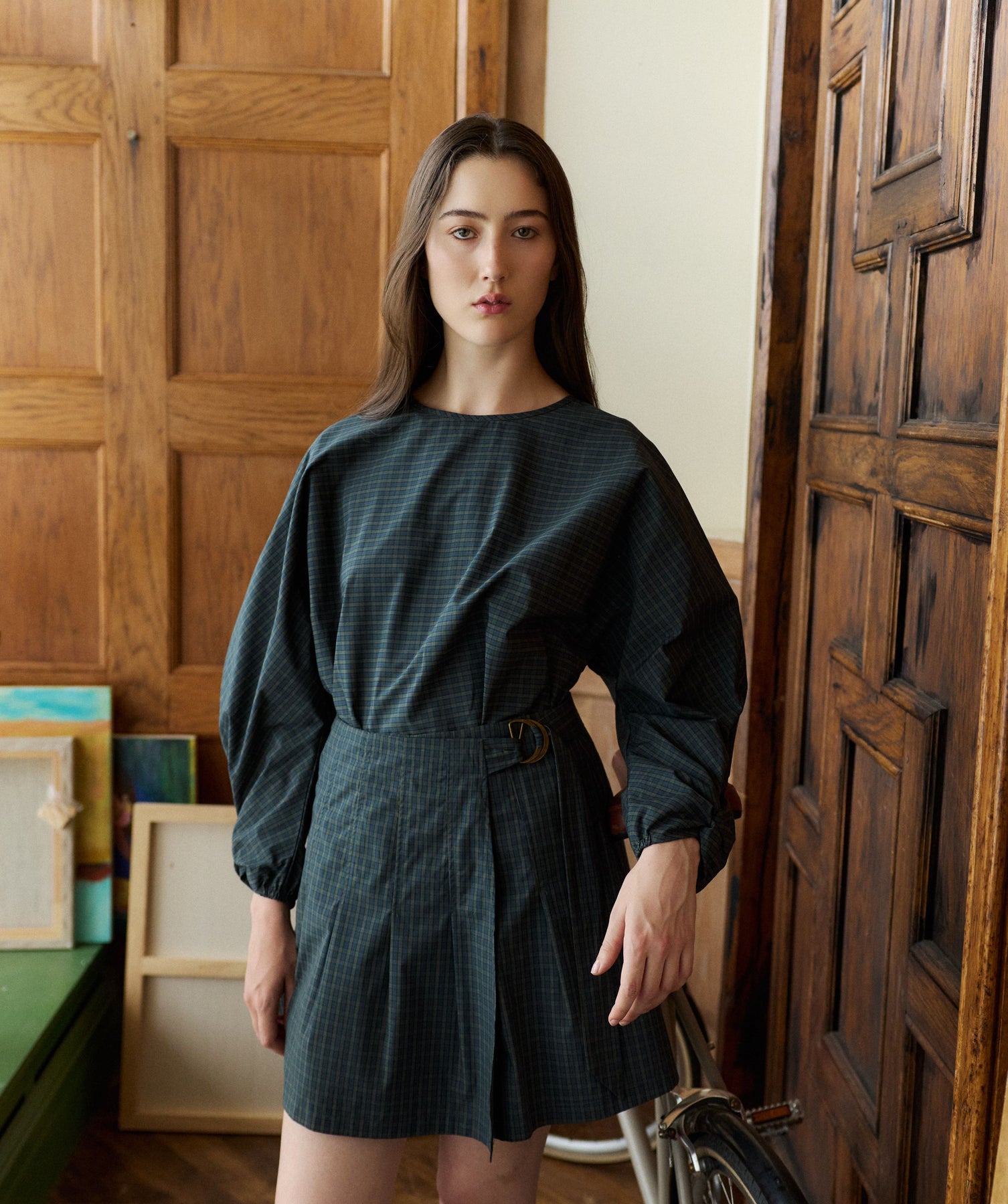Crisp cotton top with twist detailing at the cuff in our Teal & Green mini check for Autumn. This piece is a subtle statement top with a batwing bodice that allows elegance and a sharp tailoring finish. A stunning Autumn staple