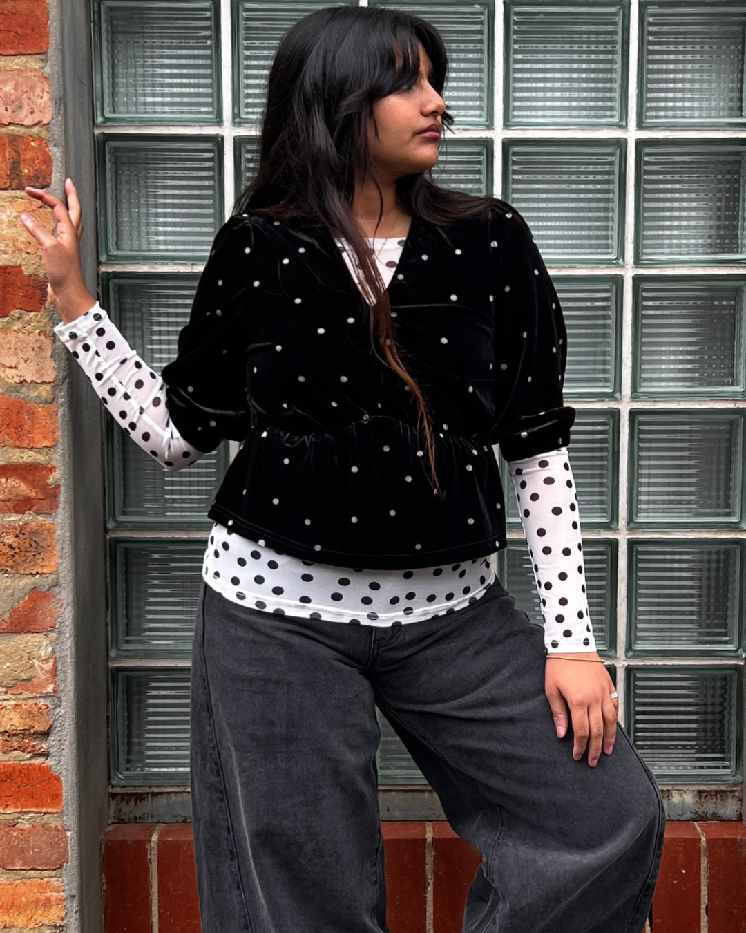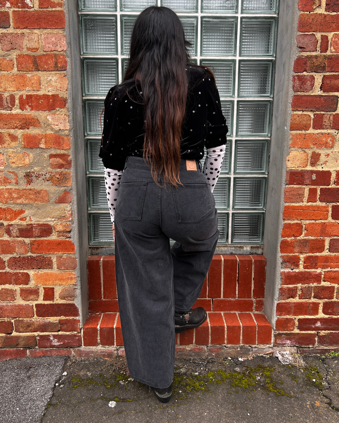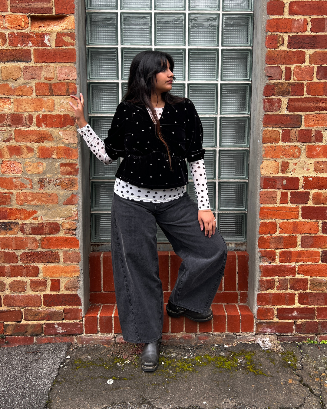 Styled here with the Faux Leather Rounded Pant, Polka Mesh Top and Inverted Denim Jean