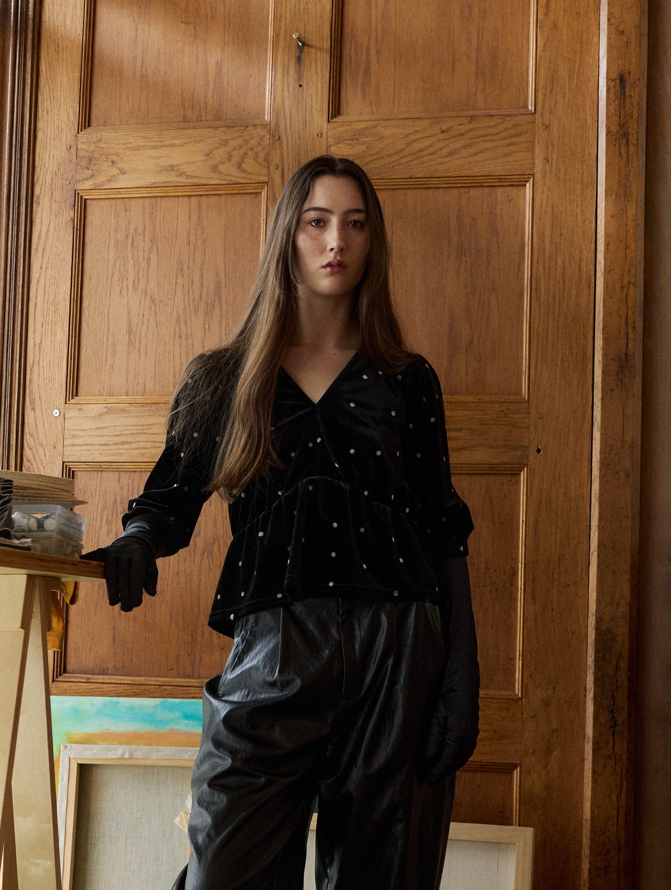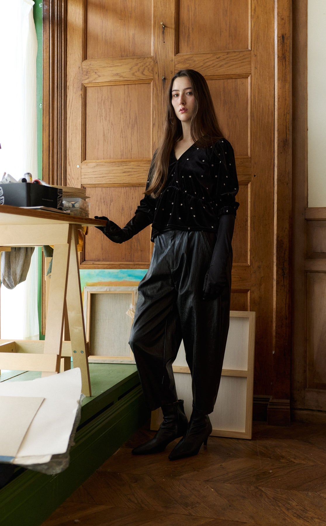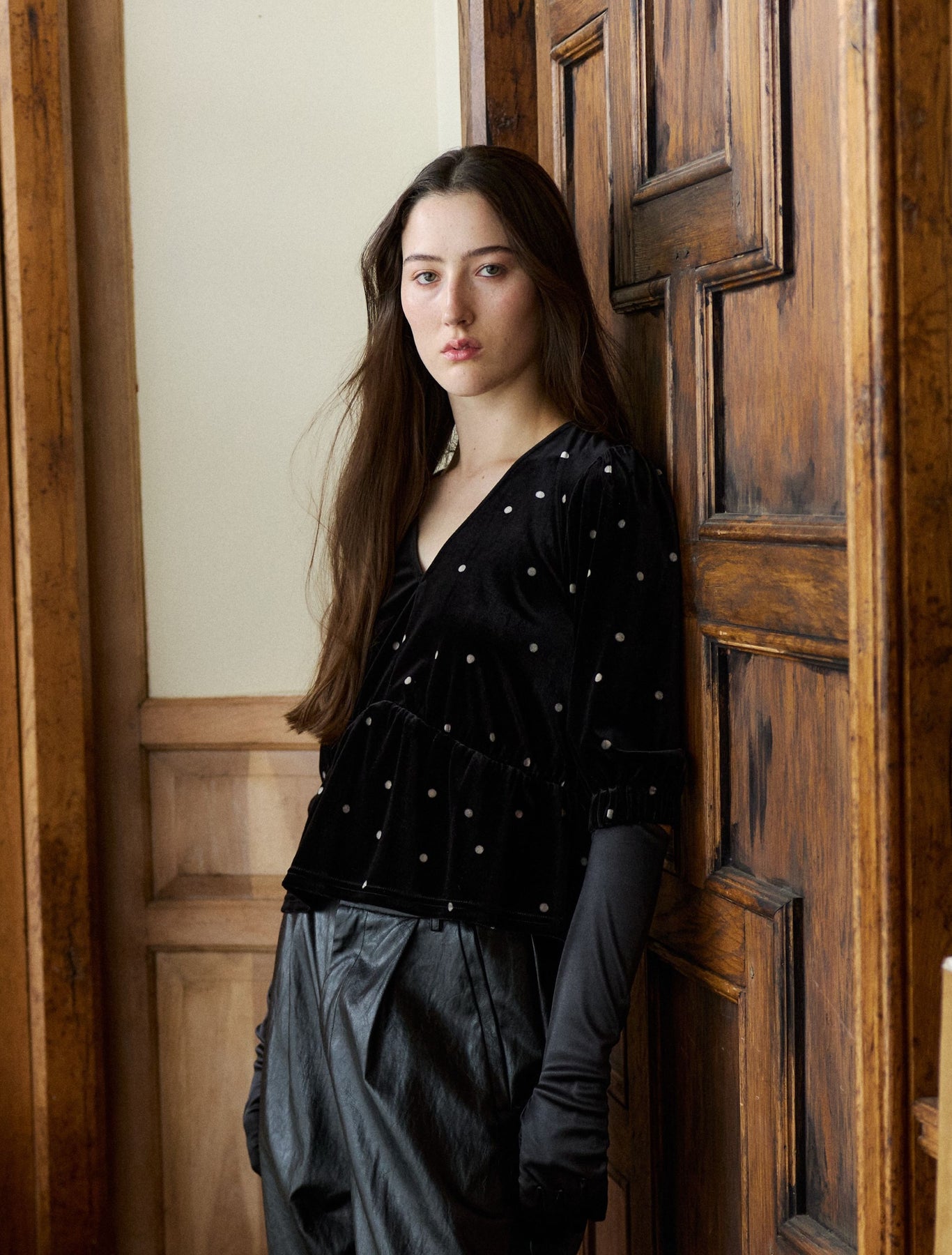Styled here with the Faux Leather Rounded Pant, Polka Mesh Top and Inverted Denim Jean