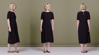 Elegant and feminine cut this style is super flattering on the body, with an angled waistline, flared A line midi skirt and a loose sleeve. Set on a round neckline with keyhole at the nape of the neck in our luxurious crepe viscose base cloth in either Pale Blue Garland Print with lilac, tan and ox blood highlights for spring, rich Burgundy, on trend lilac and classic Black. This cut has a touch of 40s nostalgia about it with its femininity but strong classic look. Inspired by the Iconic classic beauties of the 1940s era.