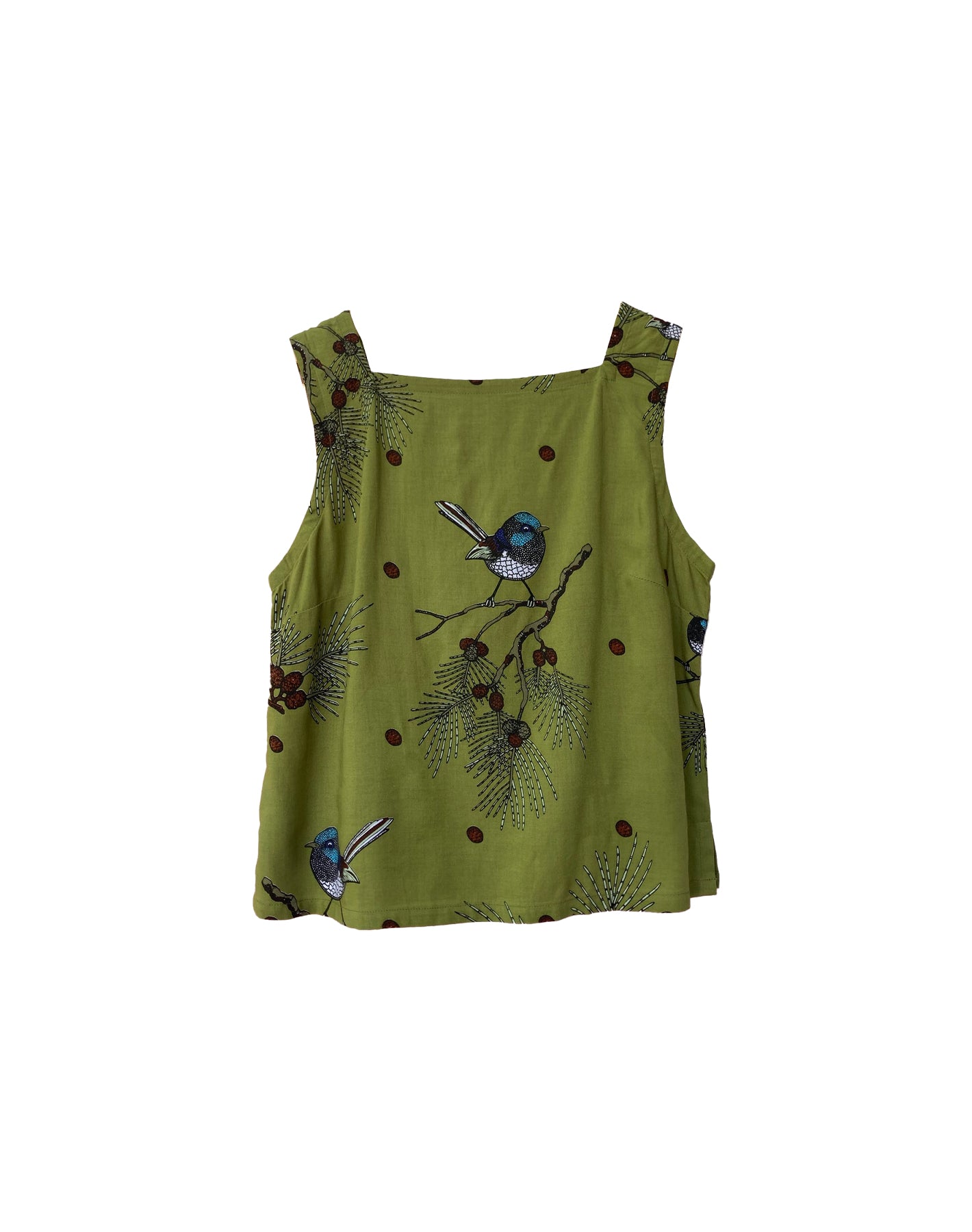 Super cute print tank with square neckline in our Bay Leaf tone in Wren print. Its a simple shape that allows the silhouette, colour and print to shine. A touch retro but very chic wear layered over fitted long sleeves or alone when the temperature rises.