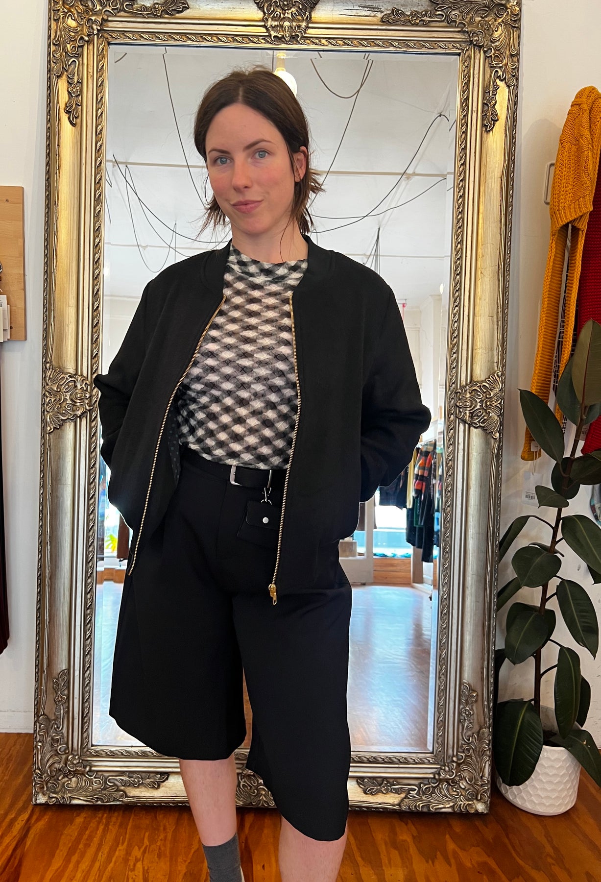 A Leonard St Classic the neat fitted felted wool bomber jacket in Black, with polka dot lining for AW26. Set on plain ribbed collar, cuff and hem band with welted pockets at the front, and with a metal zip, it's sure to lift your spirits. Style with your favourite jeans, pants, or mini.